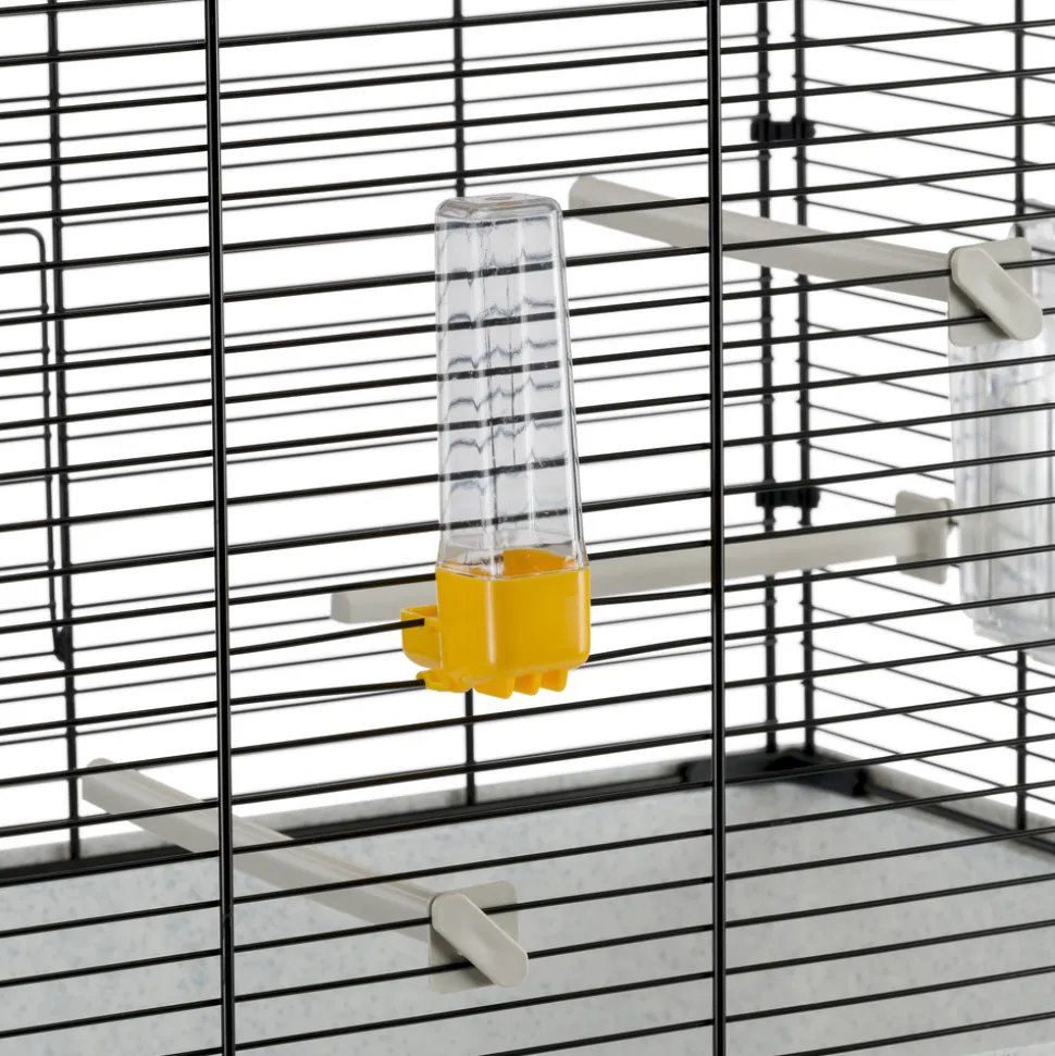 La cage oiseau Piano 4 est entièrement équipée: vous y trouverez un abreuvoir, une pince à légumes, cinq perchoirs et une balançoire à oiseaux. Enfin, les mangeoires rotatives spéciales Brava 2 vous permettent de nourrir facilement les oiseaux, elles peuvent être tournées à 180° et remplies de nourriture de l’extérieur, sans laisser d’ouverture par laquelle l’oiseau puisse s’échapper. Ils sont entièrement en plastique transparent afin de pouvoir contrôler le niveau d’alimentation disponible.