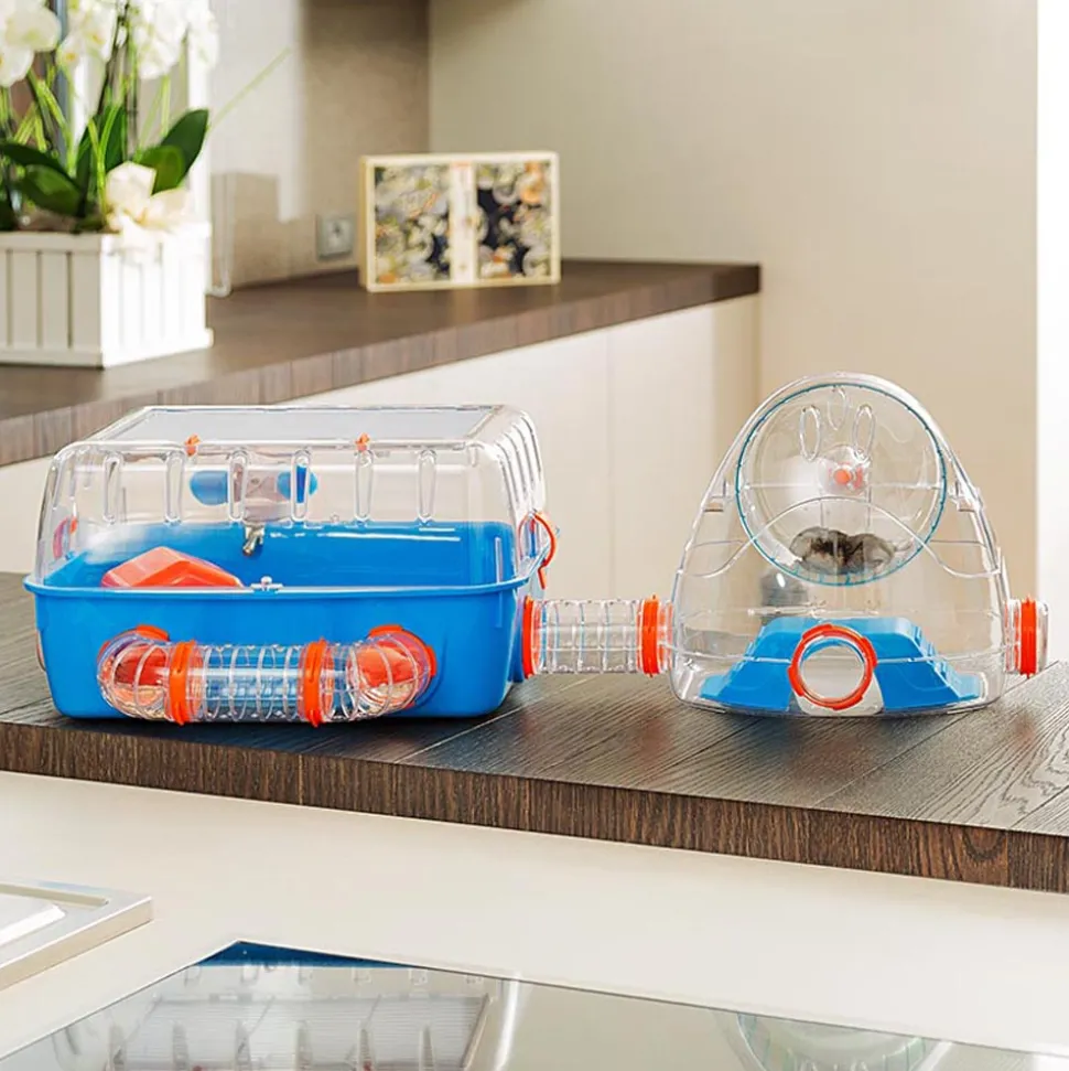 Cage pour hamsters avec toit en plastique transparent pour la visibilité de l’animal, grille sur le dessus pour une bonne aération à l’intérieur Avec module de jeux extérieur pour l’activité de vos petits animaux relié avec un tunnel Facile à nettoyer grâce au bac amovible, qui se détache facilement de la partie supérieure idéal pour être reliée à d’autres habitats pour hamsters ou tunnels pour créer un espace de jeux pour votre rongeurs Livrée avec maisonnette, abreuvoir, écuelle, roue, tubes pour le jeu et module intégré