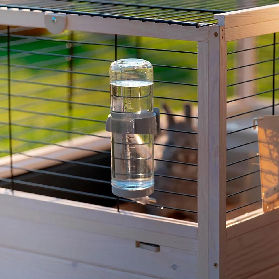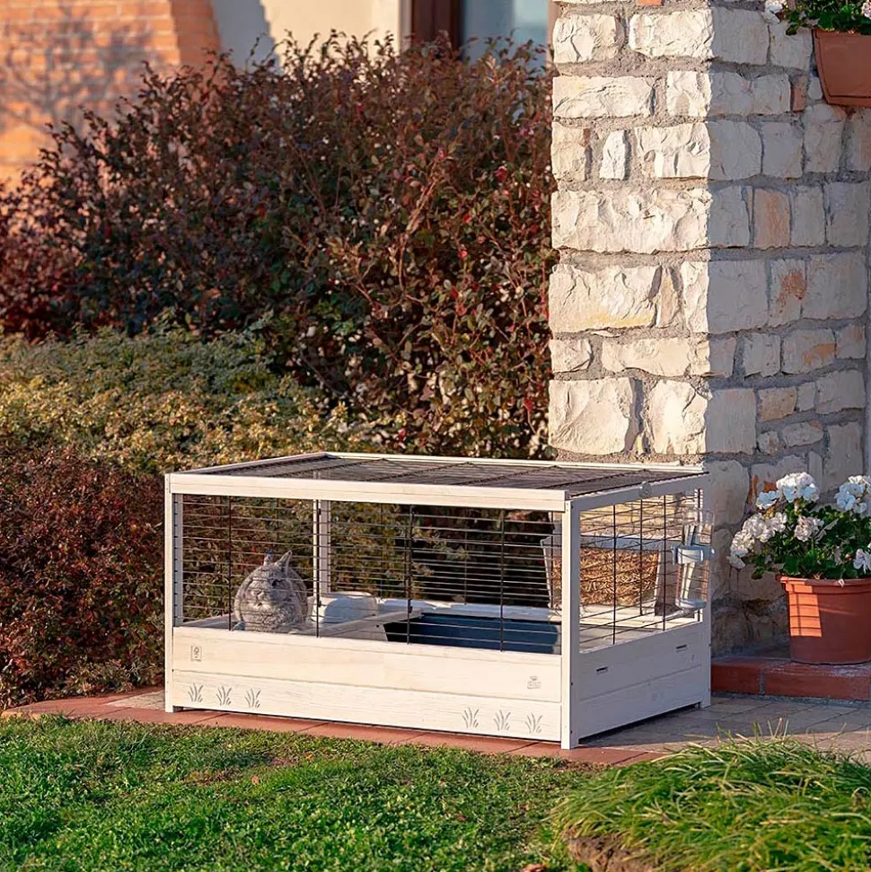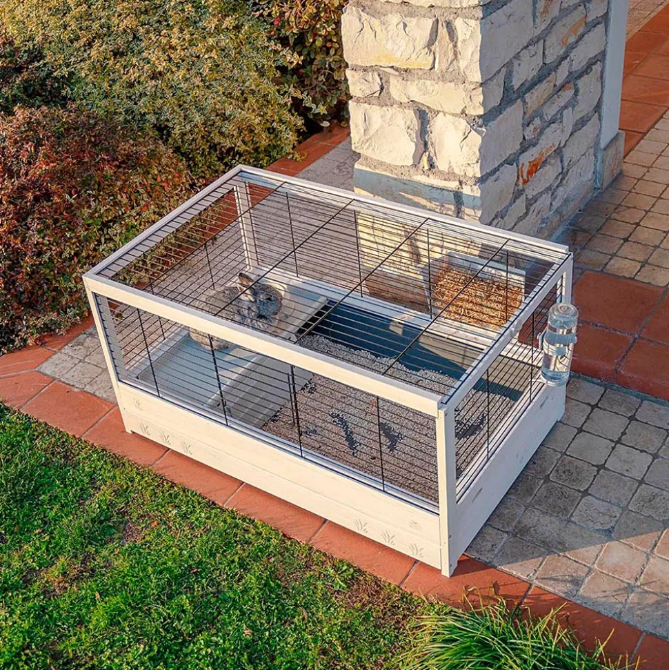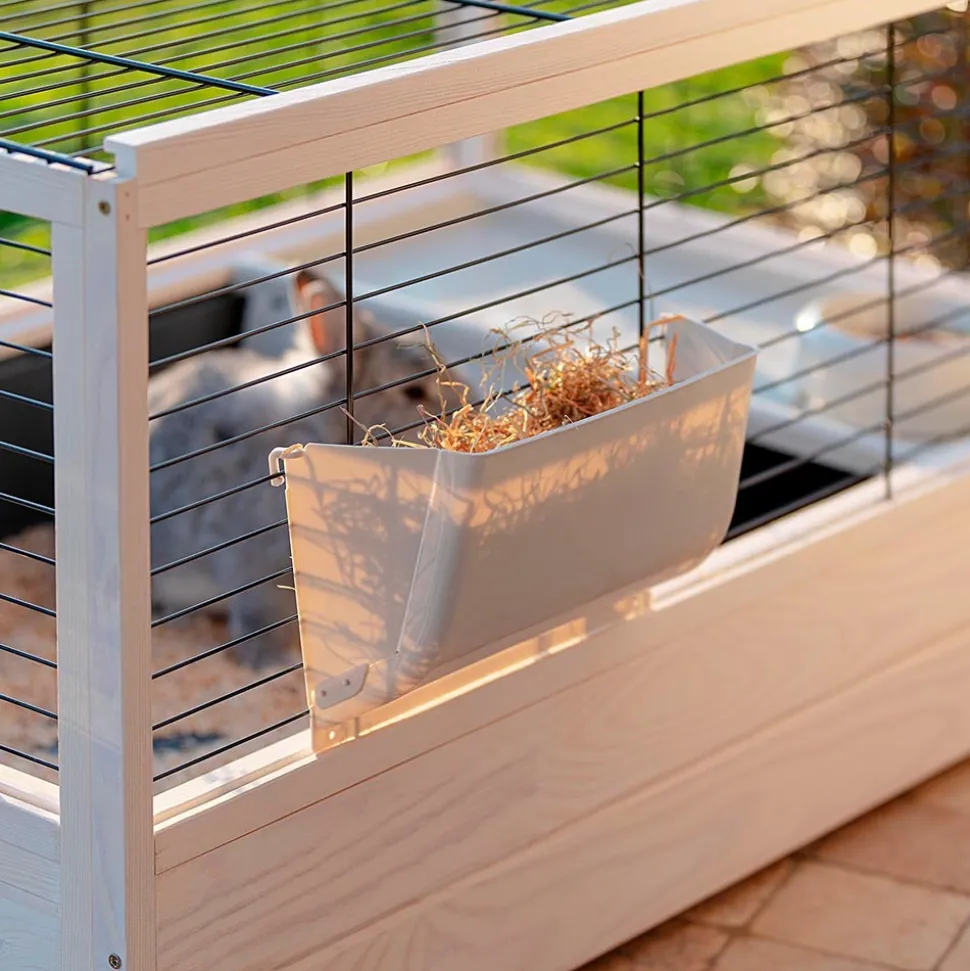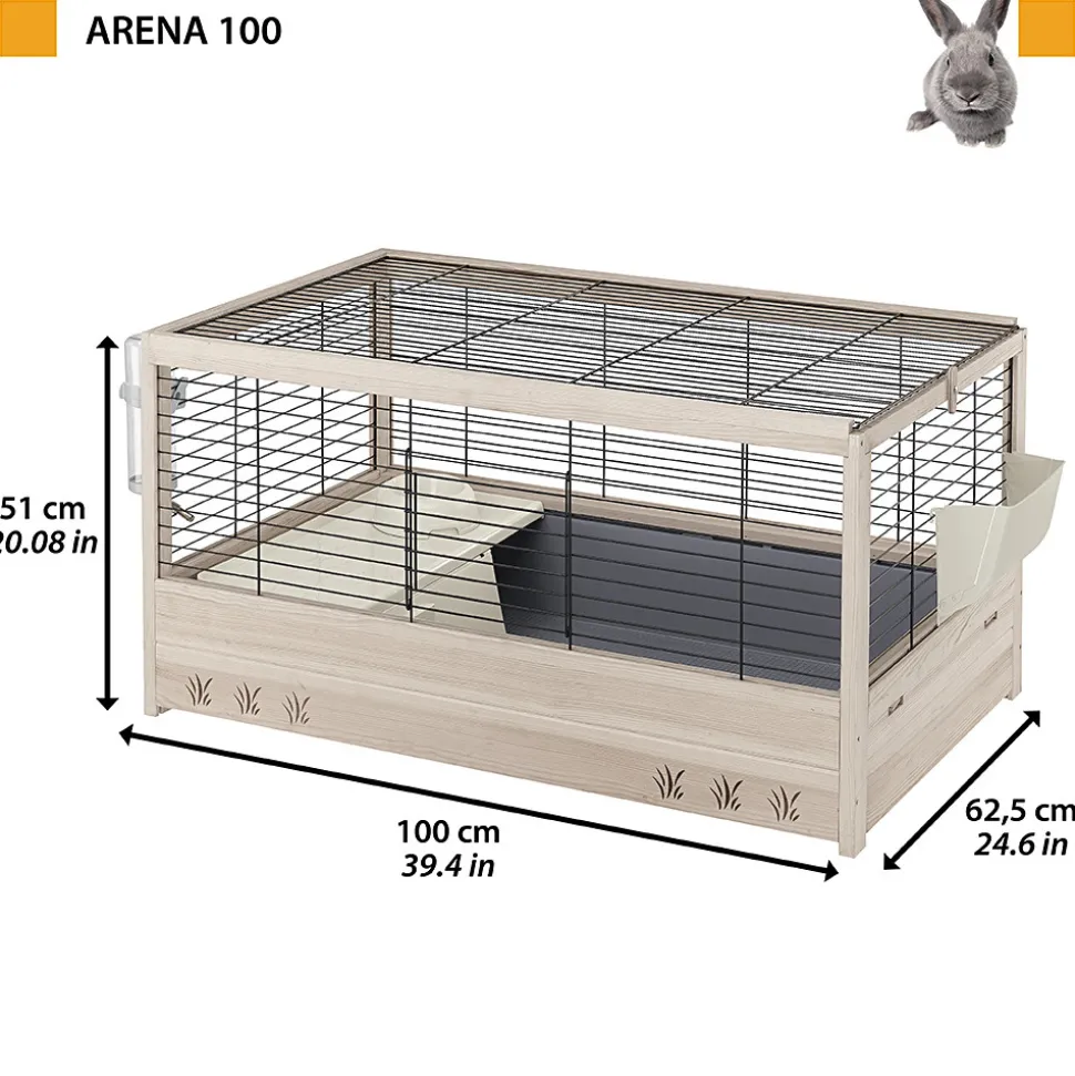 L’habitat Arena se caractérise par la combinaison parfaite d’une structure en bois légere et d’un grillage métallique peint. La gamme a plusieurs tailles pour répondre à tous les besoins: le modèle, Arena 100, est idéal comme habitat pour les lapins ou les cobayes. La cage est équipée d’ accessoires indispensables à votre rongeur pour ses activités quotidiennes: un ratelier pour le foin, un abreuvoir et une mangeoire pour la nourriture, une petite maisonnette pour les moments de détente. L’entretien ne sera pas un problème : le grand bac en plastique est amovible et pourra contenir la saleté et les restes de nourriture assurant un nettoyage facile. Toutes les cages Arena sont des produits respectueux de l’environnement, fabriqués en bois certifié FSC, c’est-à-dire provenant de forêts gérées selon des principes d’éco-durabilité en faveur de la conservation des réserves naturelles.