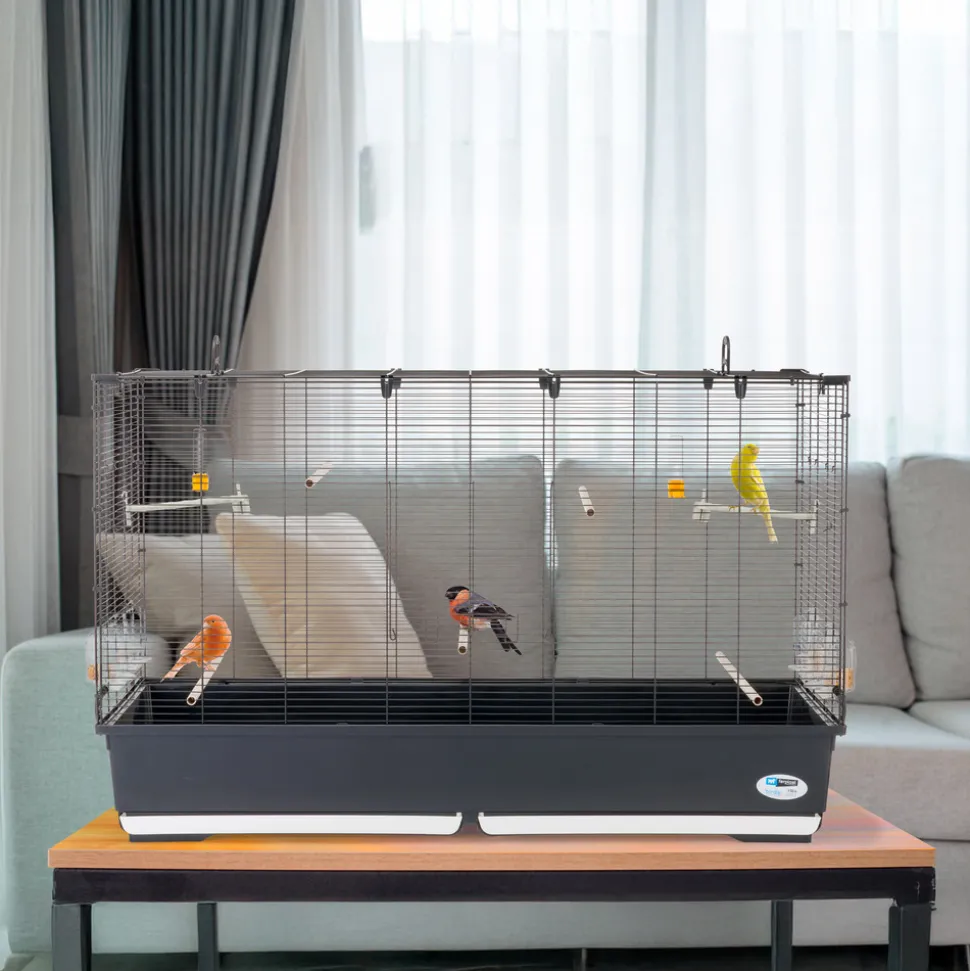 HABITAT IDÉAL: Cage à oiseaux avec espacement des barres de 9,8 mm, adaptée aux canaris, perruches, pinsons; résistant et spacieux, la cage permet la coexistence de nombreux spécimens dans un environnement protégé et sûr. PRATIQUE et FONCTIONNEL: Le fond de cette cage à oiseaux est équipé de 2 plateaux amovibles pour un nettoyage facile; Les mangeoires rotatives BRAVA sont uniques et innovantes car elles peuvent être remplies sans être retirées. DESIGN ITALIEN: Ferplast est une société italienne et cette Cage a été entièrement conçue en Italie avec le plus grand soin et cette attention aux détails qui distingue le Made in Italy. ACCESSOIRES INCLUS: 4 mangeoires rotatives BRAVA 2 et 2 abreuvoirs garantissent à tout moment la nourriture et l’eau nécessaires aux différents spécimens, les 7 perchoirs offrent suffisamment d’espace pour se reposer. Support disponible séparément. DIMENSIONS D’ENCOMBREMENT: 118 x 59 x h 75 cm. ESPACEMENT DES BARRES: 9,8 mm. DIAMÈTRE DES BARRES: 1,5 – 3,5 mm.
