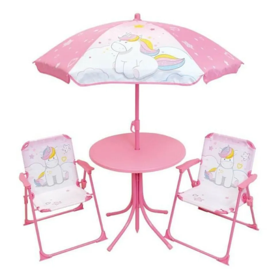 Votre petite princesse sera ravie de s’installer a l’extérieur comme une grande sur son salon de jardin a l’effigie de son personnage féérique préféré La Licorne ! Ces 2 chaises pliantes et la table sont faciles a plier et donc a ranger ou a transporter. Le parasol permettra que votre enfant s’installe a l’ombre.