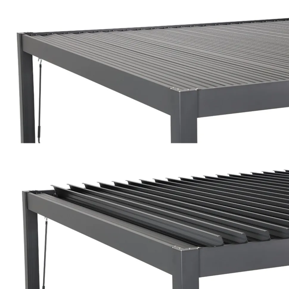 La pergola ne craint pas les intempéries et peut rester dehors toute l’année. En cas de pluie fine, repliez les lames pour que l’eau s’évacue dans les gouttières intégrées aux pieds de la pergola. Pendant les périodes d’inutilisation, laissez les lames en position ouverte pour prolonger la durée de vie de la pergola et en cas de neige abondante ou de vent violent.
