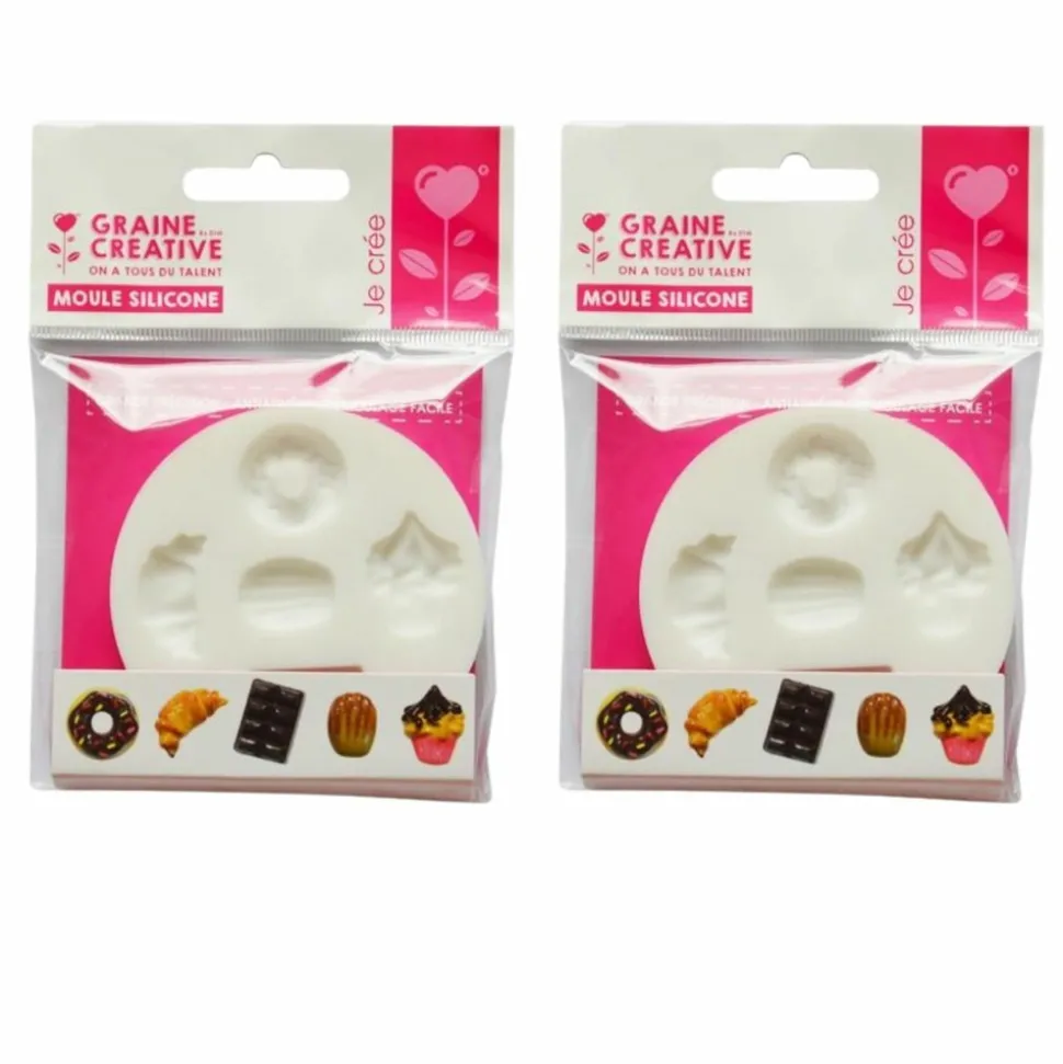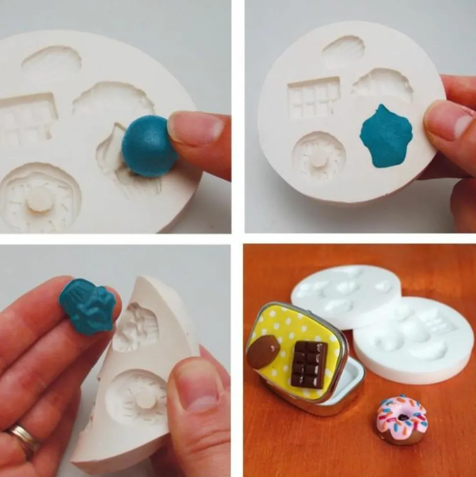 Ces moules en silicone vous permettront de réaliser 2 x 5 miniatures décoratives sur le thème de la gourmandise : donut, croissant, tablette de chocolat, madeleine et cupcake. Extra flexible, vous démoulerez facilement vos créations et obtiendrez des motifs de haute précision. Il est idéal pour réaliser des miniatures décoratives, pour la carterie, les scrapbooking, la bijouterie,… Il s’utilise avec de la pâte polymère (la cuisson est possible avec le moule), du plâtre, de la poudre céramique, de la résine ou encore de la pâte Oyumaru… Pour nettoyer votre moule en silicone, il vous suffit de le passer sous de l’eau savonneuse. Dimensions des miniatures : entre 1,5 et 2,5 cm.