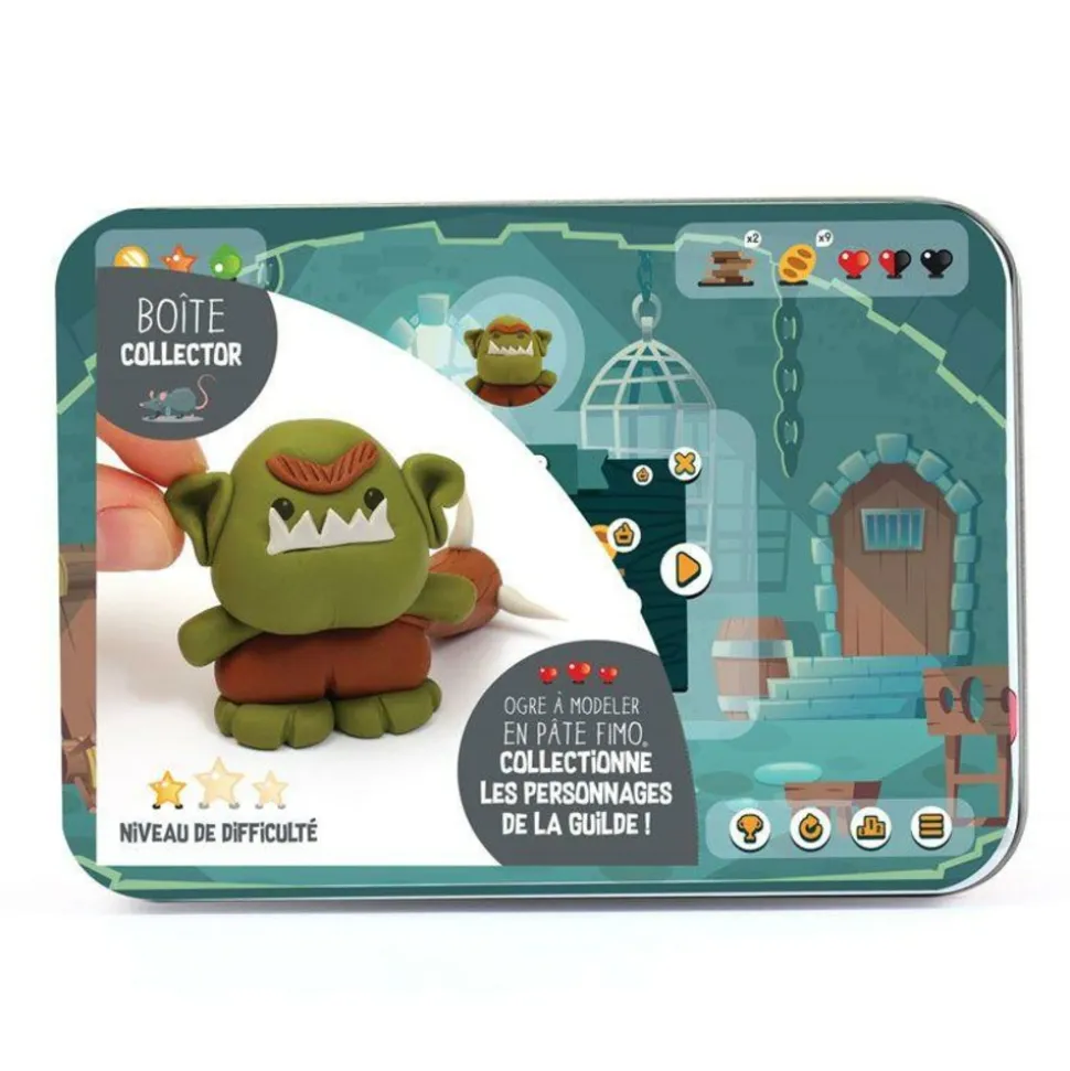 Faites la collection des personnages de la guilde ! Ces boîtes en métal sont collector ! Réalisez de petites figurines en pâte polymère grâce à tous les ustensiles nécessaires de la boîte ! La boîte Ogre, de niveau de difficulté 1 étoile, contient : trois pains de pâte polymère de 25 g chacun (marron clair, kaki, blanc), des transferts pour les yeux, une notice illustrée, et une carte collector à collectionner.