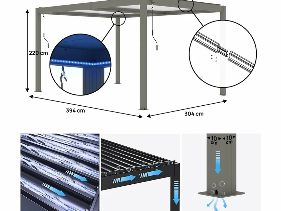 le + produit : Structure en aluminium antirouille et anti-UV Résiste aux vents jusqu’à 15 m/s (54 km/h) 25 lames orientables pour un contrôle optimal de la lumière et de la ventilation.