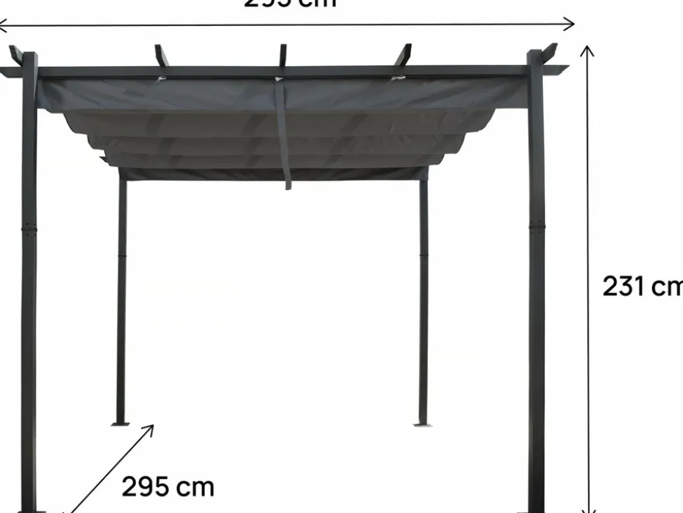Avec ses dimensions généreuses 295 x 295 x 231 cm, elle offre un grand espace ombragé, idéal pour aménager un coin confortable dans votre jardin ou sur votre terrasse. Sa conception spacieuse est parfaite pour accueillir vos repas en extérieur, un salon de jardin ou des moments de détente en famille ou entre amis. Le toit rétractable de cette pergola permet d’ajuster manuellement et facilement l’ombre et la lumière selon vos besoins, le tout grace à une languette facile d’utilisaion, offrant ainsi une protection contre le soleil ou laissant entrer la lumière naturelle. Sa structure en métal traité contre la rouille et anti-uv garantissent une durabilité exceptionnelle.
