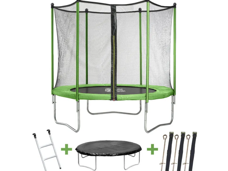 Pour faciliter l’accès au trampoline, ce dernier est équipé d’une échelle en acier galvanisé. Enfin, les poteaux du trampoline ainsi que les ressorts sont recouverts d’une mousse et d’un matelas de protectionet lekit d’ancrage fournivous permet de fixer solidement votre trampoline au sol.