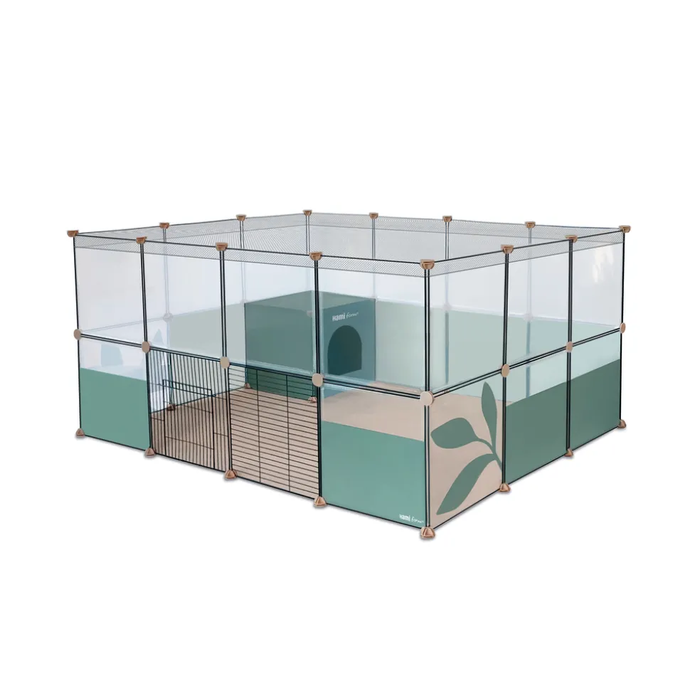 Conçu pour offrir à votre petit compagnon espace, confort et sécurité au quotidien, ce parc s’intègrera harmonieusement à votre intérieur. Le parc Naveen est composé de 31 panneaux qui se fixent facilement entre eux à l’aide de clips robustes : 20 panneaux en partie décorés ou entièrement translucides, 9 panneaux opaques dédiés à former une cabane et un espace intime où votre animal pourra se reposer, 2 grilles dont une est équipée d’une porte pour que votre animal puisse entrer et sortir à sa guise, 1 filet de sécurité 1 tapis de protection. Parc Naveen pour lapin nain & cochon d’inde 1.40×1.05×0.72m.