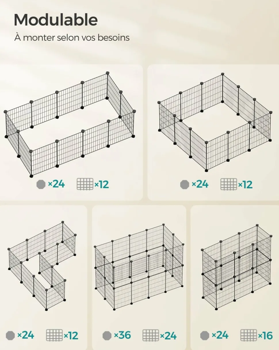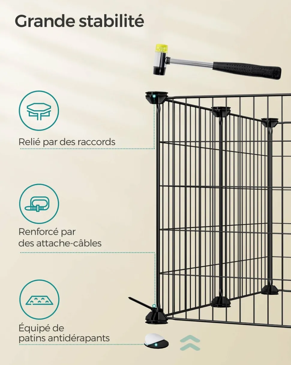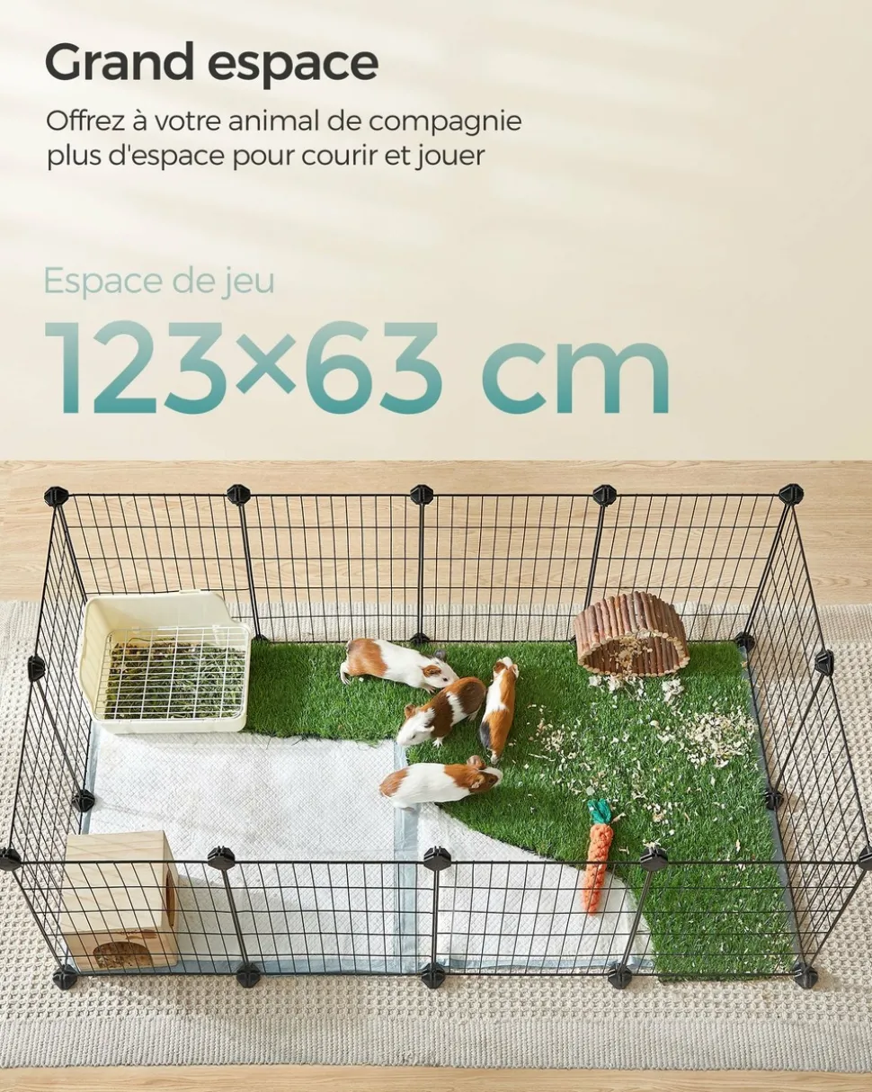 Offrez à votre petit compagnon un espace où il pourra se sentir comme chez lui. Que vous ayez un lapin, un hérisson ou un hamster, cet enclos spacieux leur permet de jouer et de se reposer en toute tranquillité. Conçu pour la sécurité des animaux, l’écartement entre les fils a été réduit à 2,2 cm. Cela évite que les plus petits ne restent coincés tout en assurant une bonne circulation de l’air. La structure est solide grâce aux raccords en plastique ABS résistants, qui maintiennent l’ensemble bien en place sans se déformer lors des déplacements. Des patins antidérapants sont également inclus afin de protéger le sol contre les rayures. Cet enclos est modulable : grâce aux panneaux et aux raccords, vous pouvez l’assembler selon vos envies et créer différentes formes pour adapter l’espace à vos besoins. L’installation se fait facilement, presque comme un jeu de construction. Vous disposez de tout le nécessaire pour créer un environnement sûr et confortable : panneaux métalliques robustes, raccords en plastique, feutres antidérapants, serre-câbles pour renforcer la structure et même un maillet pour le montage. Couleur : Noir Matériaux : Acier, plastique ABS Dimensions : 123 x 63 x 41 cm (L x l x H) Poids : 3,8 kg Contenu de l’emballage : 12 x Panneau métallique (40 x 30 cm) 26 x Raccord en plastique ABS 42 x Serre-câble 12 x Feutre antidérapant 1 x Maillet en caoutchouc 1 x Mode d’emploi