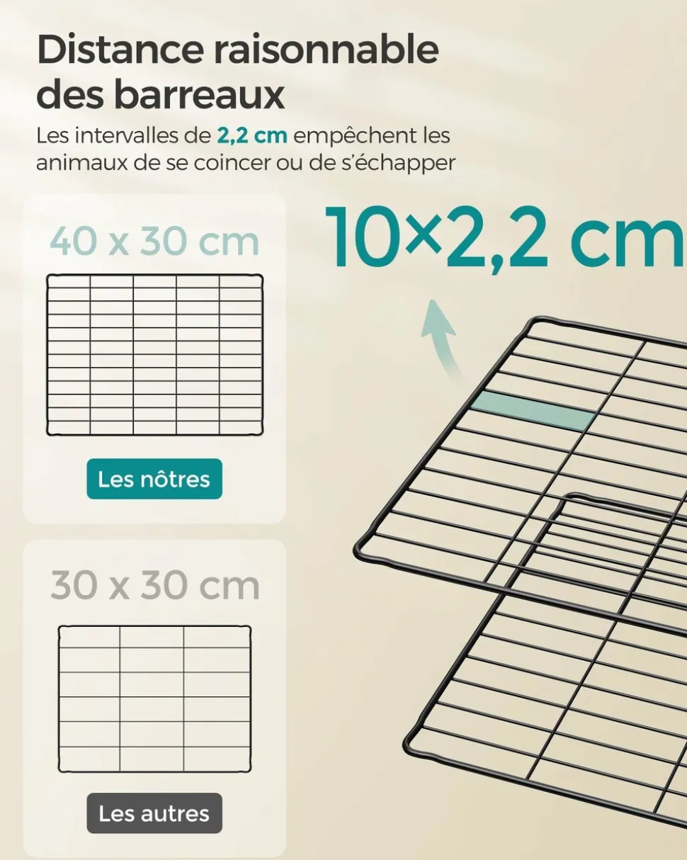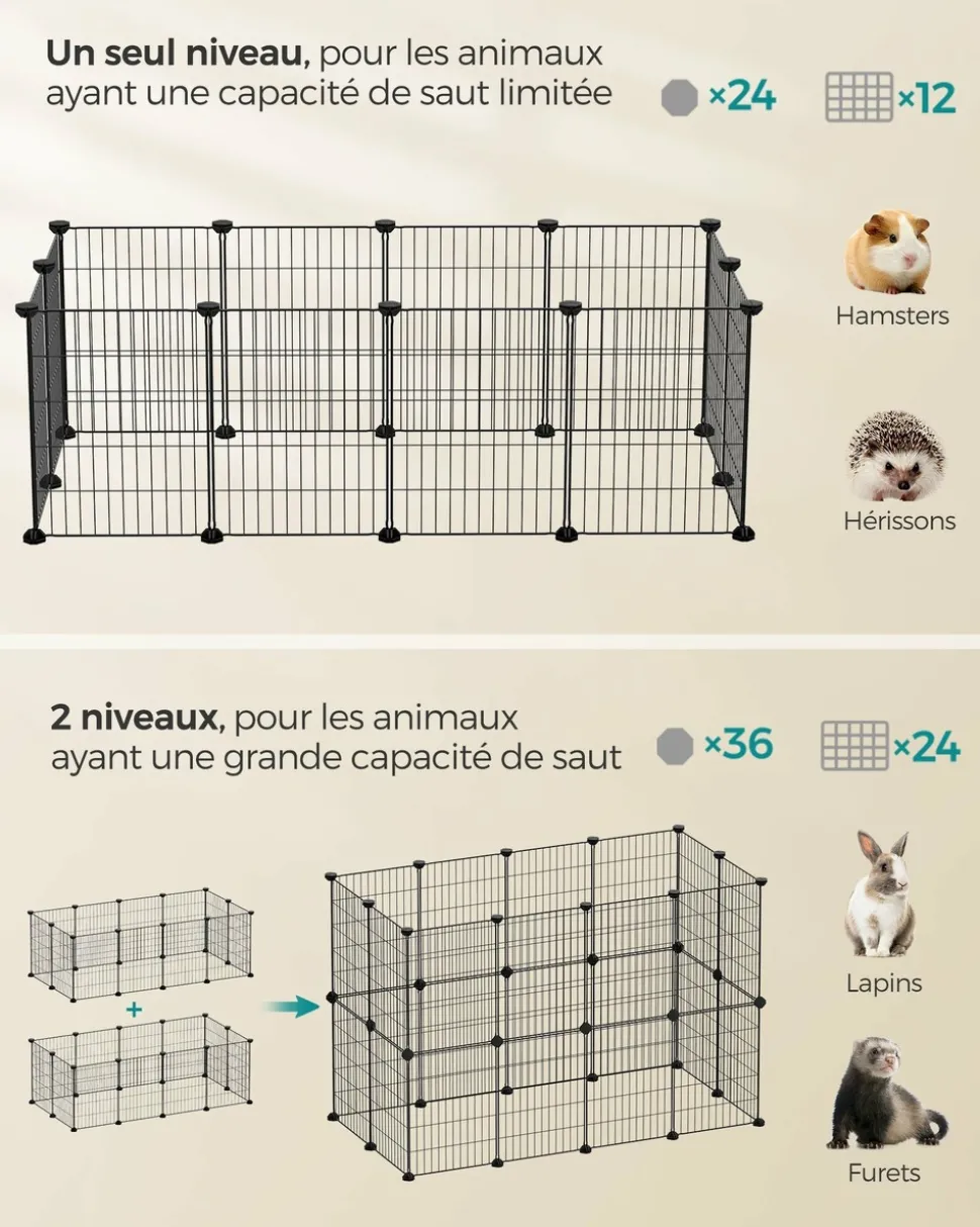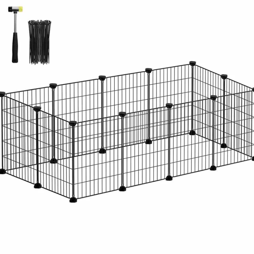 Offrez à votre petit compagnon un espace où il pourra se sentir comme chez lui. Que vous ayez un lapin, un hérisson ou un hamster, cet enclos spacieux leur permet de jouer et de se reposer en toute tranquillité. Conçu pour la sécurité des animaux, l’écartement entre les fils a été réduit à 2,2 cm. Cela évite que les plus petits ne restent coincés tout en assurant une bonne circulation de l’air. La structure est solide grâce aux raccords en plastique ABS résistants, qui maintiennent l’ensemble bien en place sans se déformer lors des déplacements. Des patins antidérapants sont également inclus afin de protéger le sol contre les rayures. Cet enclos est modulable : grâce aux panneaux et aux raccords, vous pouvez l’assembler selon vos envies et créer différentes formes pour adapter l’espace à vos besoins. L’installation se fait facilement, presque comme un jeu de construction. Vous disposez de tout le nécessaire pour créer un environnement sûr et confortable : panneaux métalliques robustes, raccords en plastique, feutres antidérapants, serre-câbles pour renforcer la structure et même un maillet pour le montage. Couleur : Noir Matériaux : Acier, plastique ABS Dimensions : 123 x 63 x 41 cm (L x l x H) Poids : 3,8 kg Contenu de l’emballage : 12 x Panneau métallique (40 x 30 cm) 26 x Raccord en plastique ABS 42 x Serre-câble 12 x Feutre antidérapant 1 x Maillet en caoutchouc 1 x Mode d’emploi