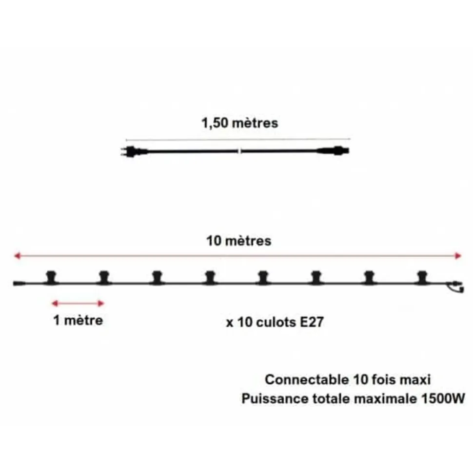 - Longueur de 10 mètres avec un espacement de 1 mètre entre chacune des 10 douilles E27