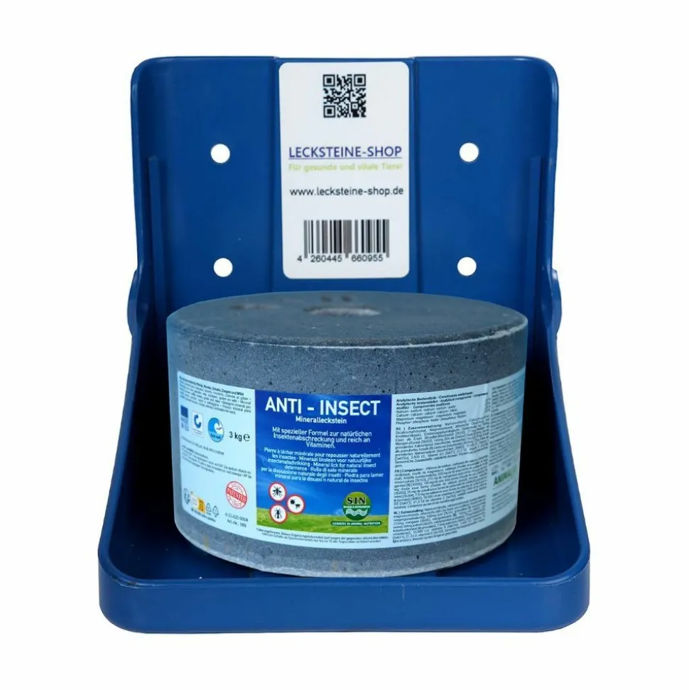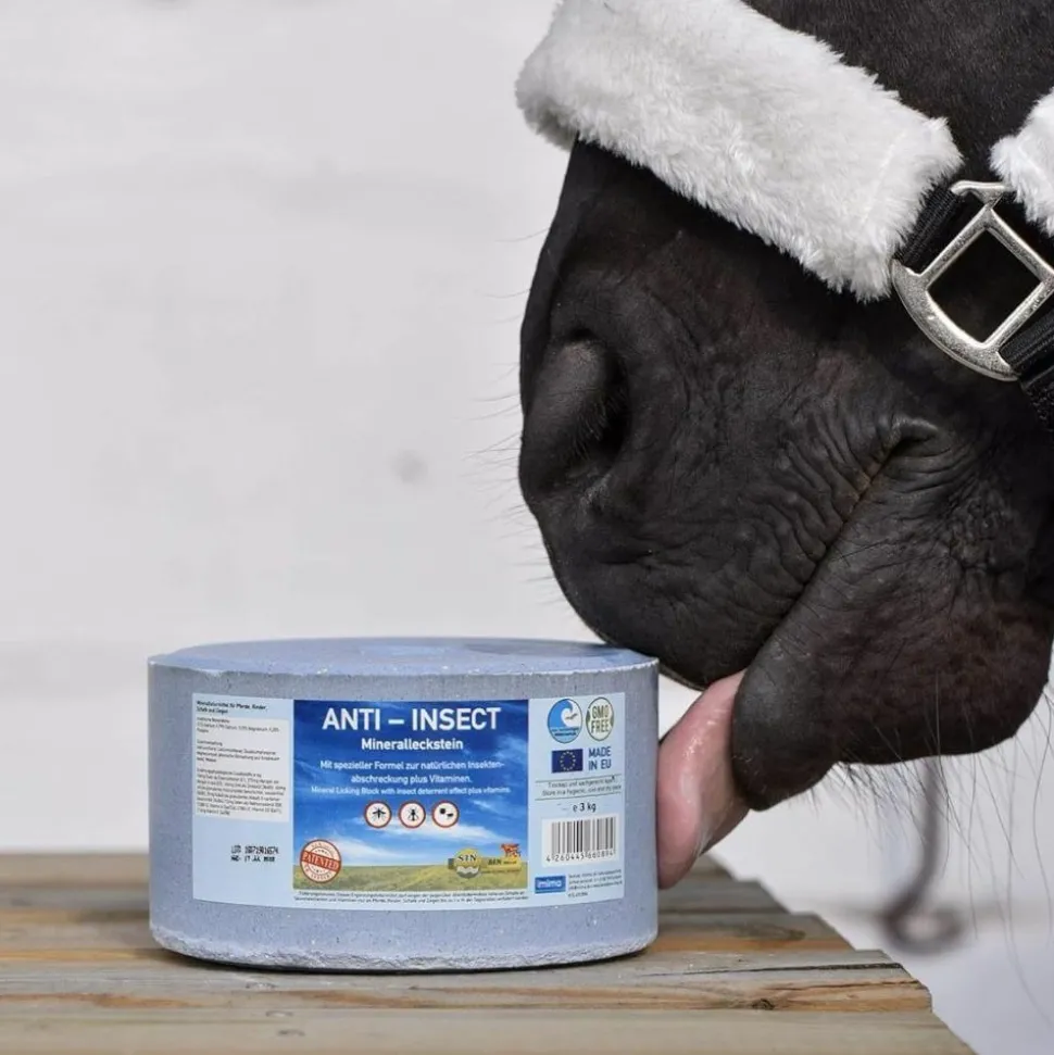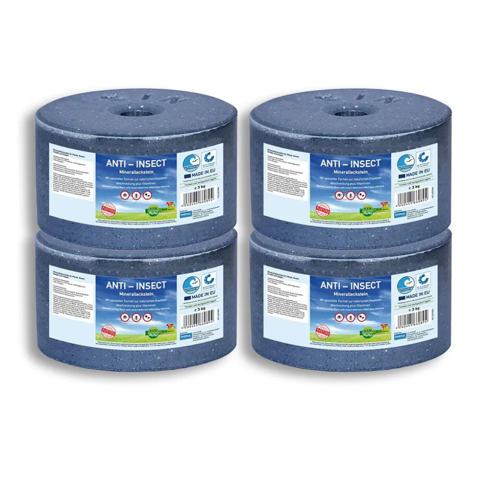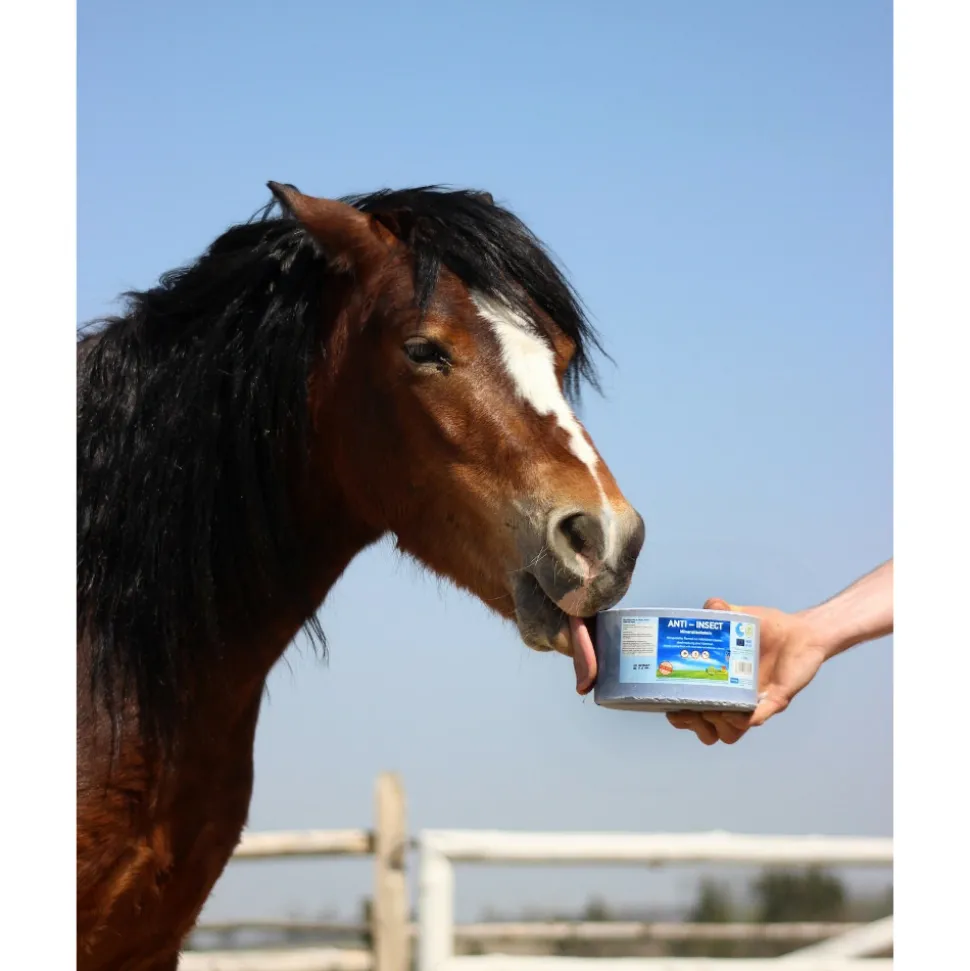 Lot de 4 pierres à lécher anti-insectes de 3 kg chacune.La pierre à lécher est une solution innovante et brevetée qui allie protection naturelle contre les insectes et apport nutritionnel essentiel. Élaborée à partir de substances actives d’origine naturelle, notamment un mélange d’huiles essentielles à base d’ail, elle agit comme un répulsif efficace contre les mouches, moustiques, puces et autres parasites indésirables. Elle est idéale pour les chevaux, mais également pour les vaches. Au-delà de son effet répulsif, cette pierre à lécher permet également à l’animal de couvrir ses besoins en minéraux, oligo-éléments et vitamines, participant ainsi activement à son bien-être général. Enrichie en sel de mer méditerranéen, elle contient du sodium, du calcium, du magnésium, du phosphore et d’autres éléments bénéfiques comme le fer, le zinc, le sélénium, le manganèse ou encore la vitamine E. Grâce à sa composition, la pierre à lécher anti-insectes soutient le système immunitaire, aide à maintenir une bonne circulation sanguine et favorise un pH neutre dans l’estomac. Elle contribue ainsi à une meilleure digestion et au bon fonctionnement du métabolisme. En limitant les nuisances causées par les insectes, elle aide à réduire le stress de l’animal, ce qui peut avoir un impact positif sur sa santé globale. Cette pierre à lécher est disponible en blocs solides (vendu sans support d’accroche), faciles à disposer dans les espaces de vie des animaux. Caractéristiques : Animaux : chevaux, bovins, ovins, caprins et gibiers Fabriquée en Grèce Composants analytiques :35,7% de sodium (sel de mer), 0,79% de calcium, 0,35% de magnésium, 0,25% de phosphore. Composition :Chlorure de sodium, carbonate de calcium, phosphate dicalcique, oxyde de magnésium, mélange d’huiles essentielles (à base d’ail), mélasse (0,3 %). Additifs nutritionnels par kg :930 mg de fer sous forme de sulfate de fer