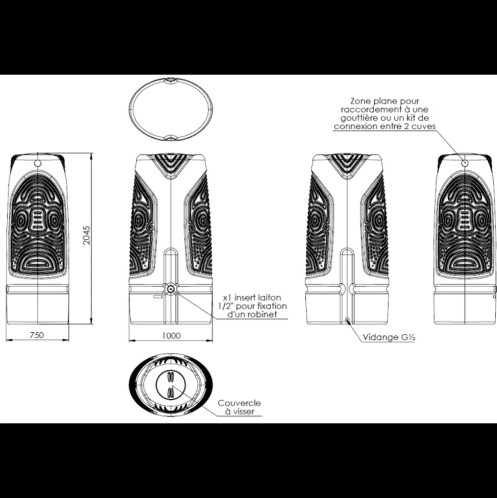 Une sculpture à exposer dans votre jardin ou sur votre terrasse pour enjoliver votre extérieur tout en récupérant l’eau de pluie !Le récupérateur d’eau de pluie ETHNO, en résine haute densité anti-UV, est résistant, anti-algues et facile à raccorder aux gouttières, offrant une solution durable et esthétique pour stocker l’eau de pluie. Il est également équipé d’un robinet en laiton inclus pour un usage pratique et efficace.