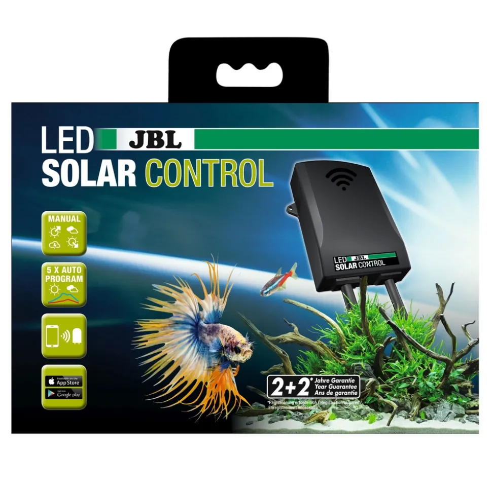 La réussite d’un aquarium est intimement liée à la qualité de son système d’éclairage. Il doit permettre de restituer fidèlement les couleurs de vos poissons et décors tout en recréant les conditions d’une croissance saine pour vos plantes sans apparition d’algues indésirables. JBL a développé une gamme complète d’équipements conçus pour reproduire les conditions d’éclairage observées dans les milieux d’origine de nos poissons d’aquarium. La rampe d’éclairage Solar Natur est à la base du système d’éclairage performant développé par JBL pour les aquariophiles les plus exigeants. Vous pouvez optimiser davantage les conditions d’éclairage de votre aquarium en vous équipant également d’une lampe Solar Effect JBL. Vous piloterez facilement l’éclairage de votre aquarium en optant pour une centralisation des commandes de vos lampes au moyen d’une application sur mobile. Découvrez cet appareil de commande pilotable par application sur smartphone pour gérer votre rampe JBL Led Solar Natur seule ou combinée avec une lampe JBL Led Solar Effect. Commandez les données des biotopes reconstitués dans votre aquarium avec votre portable (effets divers, orages, phases lunaires, levers et couchers de soleil). Utilisation facile : remplacez le récepteur IR en place par le JBL Led Control et commandez les effets désirés par l’application installée sur votre portable. 5 programmes consultables + un programme supplémentaire pour optimiser votre propre éclairage par simple saisie manuelle de vos paramètres (biotopes Amérique du Sud et Afrique, plantes d'(Aucune suggestion), poissons rouges, aquarium communautaire, phase d’acclimatation prévue pour chaque programme). Les données de biotopes comprennent saison sèche et saison des pluies, nuages, orage, ainsi que lever et coucher de soleil qui peuvent être ajustés sur la position géographique réelle du biotope reconstitué (la lumière s’allume quand le soleil se lève à cet endroit). Contenu : appareil de commande à intégrer au système JBL Led Solar pour 2 lampes (1 Natur et 1 Effect). L’application nécessaire est toujours gratuite. Télécommande pour rampe d’éclairage Led Solar Control.