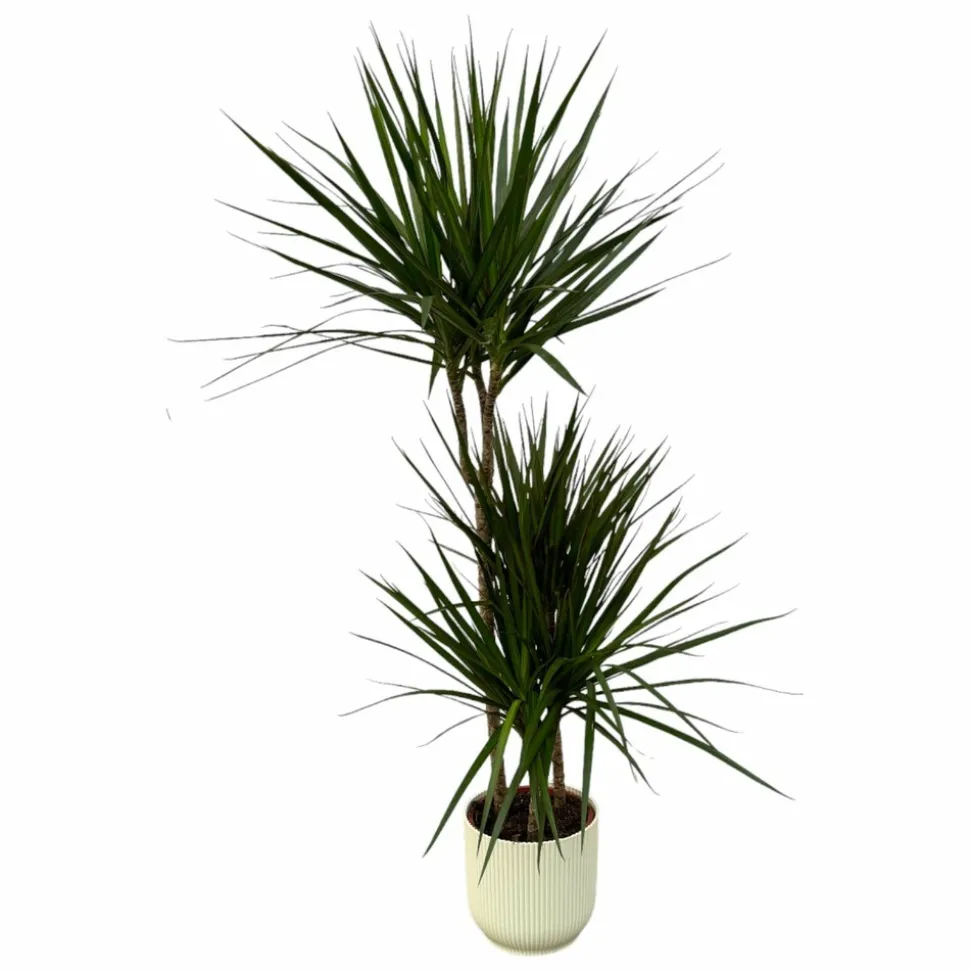 Dracaena Marginata avec Pot – Élégance Graphique et Touche Tropicale (Ø 21 cm, ↕ 120 cm) Ajoutez une note de sophistication naturelle à votre intérieur avec la Dracaena Marginata, une plante d’intérieur prisée pour son allure graphique et son entretien facile. Avec un diamètre de 21 cm et une hauteur de 120 cm, cette plante est idéale pour les espaces modernes ou minimalistes, qu’il s’agisse de votre salon, bureau ou entrée. Le Dracaena Marginata se distingue par ses tiges fines et élancées, surmontées de longues feuilles pointues aux bords rougeâtres, qui apportent une touche subtile d’exotisme. Son port vertical et épuré permet d’habiller harmonieusement les espaces sans les surcharger, tout en apportant une sensation de fraîcheur et de nature. Cette plante est parfaite pour ceux qui cherchent à ajouter une touche tropicale discrète et élégante à leur intérieur. En optant pour l’ensemble plante + pot, vous bénéficiez d’un prix plus avantageux qu’en achetant ces éléments séparément. Plusieurs options de pots élégants sont disponibles pour mettre en valeur cette Dracaena Marginata et s’intégrer parfaitement dans votre décoration intérieure, créant une harmonie esthétique parfaite. Facile à entretenir, la Dracaena Marginata s’adapte à divers environnements et tolère bien la lumière indirecte. Elle demande un arrosage modéré, en faisant une plante idéale pour ceux qui souhaitent une touche de verdure élégante, sans trop d’effort d’entretien.