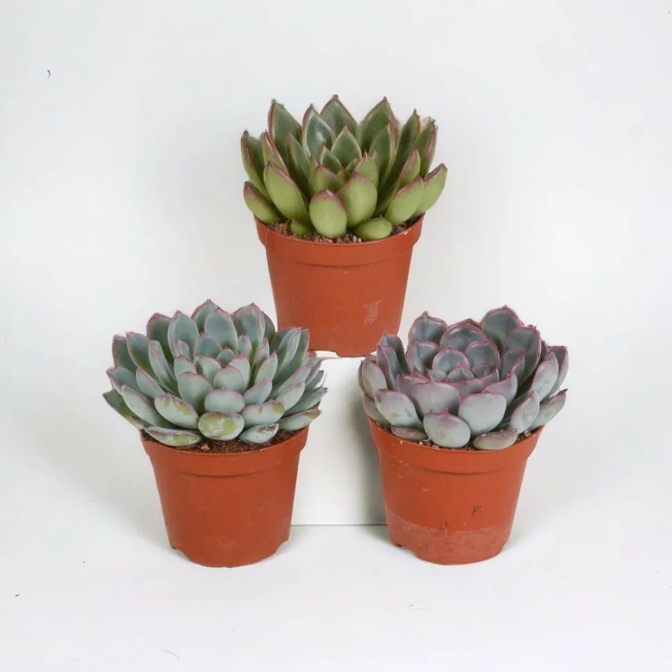 Retrouvez ce magnifique mélange de 3 echeverias qui diffèrent en couleur. Les Echeveria sont des plantes succulentes appartenant à la famille des Crassulaceae. Elles sont appréciées pour leurs rosettes de feuilles charnues et épaisses, qui peuvent prendre différentes formes, couleurs et textures. Les Echeveria sont des plantes succulentes qui préfèrent un arrosage modéré. Elles sont capables de stocker l’eau dans leurs feuilles et peuvent résister à des périodes de sécheresse. Il est important de laisser sécher le sol entre les arrosages pour éviter la pourriture des racines. Arrosez les Echeveria lorsque le sol est complètement sec. Les Echeveria préfèrent un emplacement lumineux avec une exposition directe au soleil. Elles ont besoin de lumière pour maintenir leur forme compacte et leur coloration intense. Placez-les près d’une fenêtre orientée sud ou ouest pour leur fournir une lumière vive.