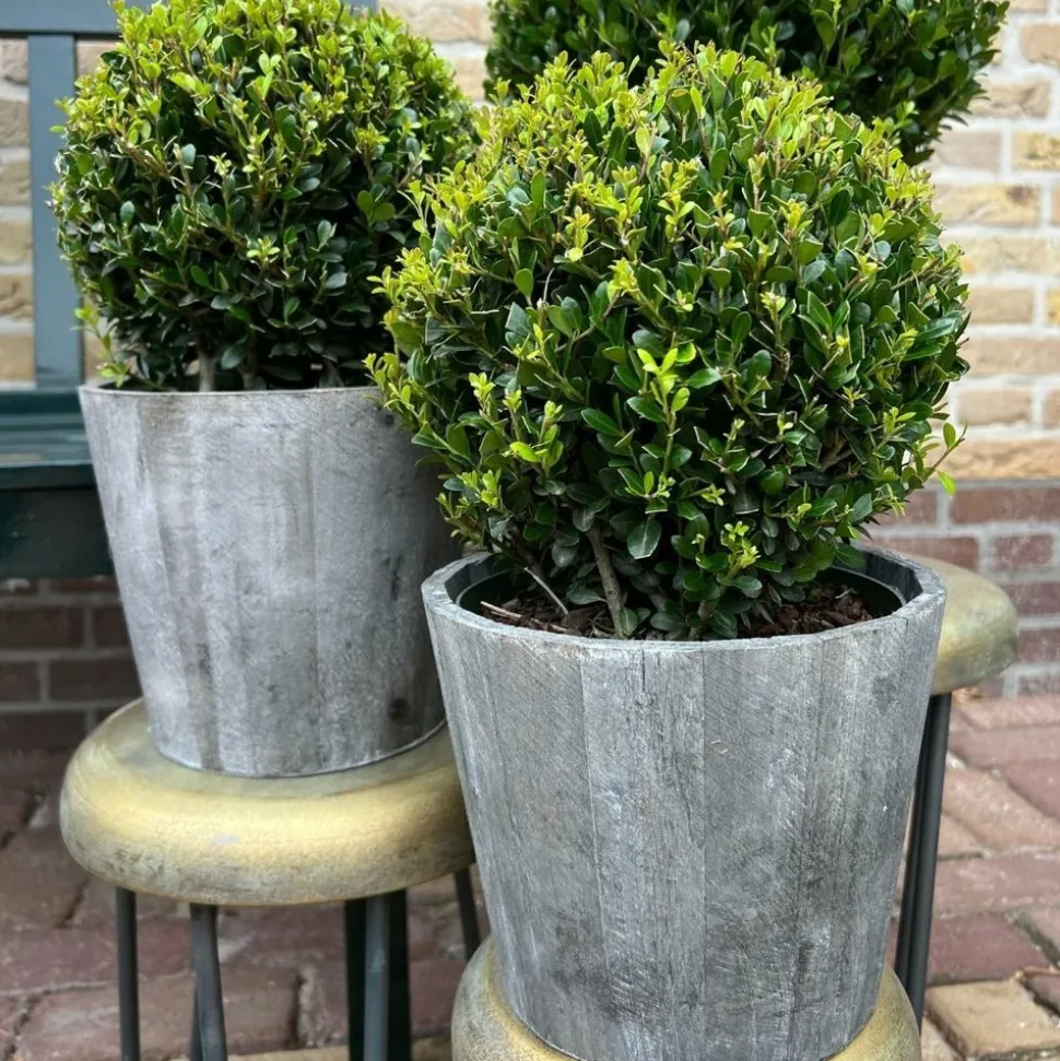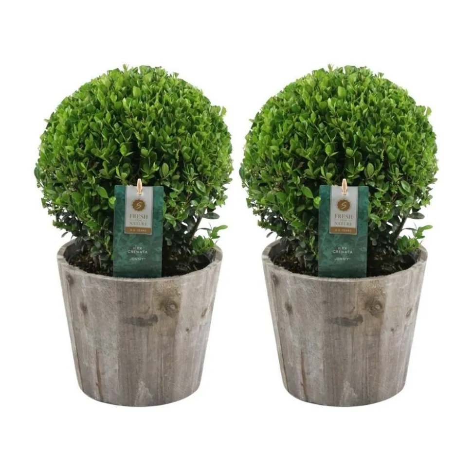 **Ilex crenata ‘Jenny’**L’Ilex crenata ‘Jenny’, également connu sous le nom de houx japonais, est un arbuste persistant idéal pour les jardins ornementaux et les haies. Cette plante se distingue par son feuillage dense et compact, composé de petites feuilles ovales, finement dentelées et d’un vert profond, rappelant celles du buis. Les jeunes feuilles peuvent présenter une teinte légèrement plus claire avant de mûrir. En été, de petites fleurs blanches discrètes apparaissent, suivies de baies noires en automne, ajoutant de l’intérêt visuel tout au long de l’année. L’Ilex crenata ‘Jenny’ est particulièrement résistant aux maladies et aux ravageurs, et il s’adapte bien à diverses conditions de sol, bien que préférant un sol acide. Peu exigeant en entretien, il tolère bien la taille, ce qui le rend parfait pour des topiaires ou des haies structurées. Attention toutefois à éviter les expositions trop ombragées ou directement en plein soleil au sein de régions très chaudes.