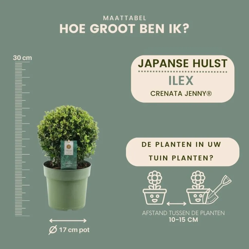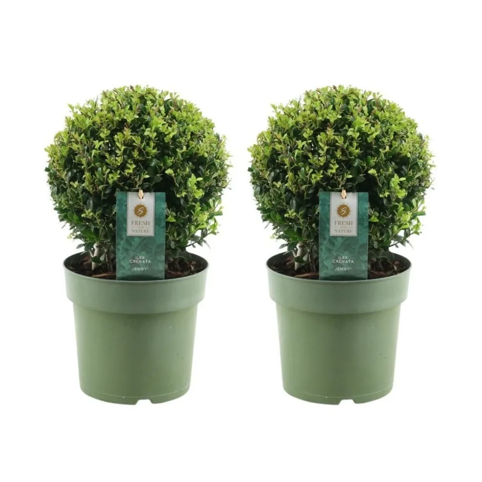 L’Ilex crenata ‘Jenny’ est un arbuste ornemental qui apporte une touche de raffinement à votre jardin. Il s’agit d’un lot de deux plantes, chacune mesurant environ 20 cm de diamètre. L’Ilex crenata ‘Jenny’ est connu pour sa forme compacte et ses petites feuilles vert foncé qui ressemblent à celles du buis. C’est une plante très appréciée pour sa résilience et sa capacité à prospérer dans diverses conditions météorologiques. Cet arbuste est idéal pour la création de haies basses ou pour l’ornement de jardins de rocaille. Il est également très apprécié en bonsaï grâce à son feuillage persistant. La croissance de l’Ilex crenata ‘Jenny’ est relativement lente, ce qui lui permet de maintenir sa forme pendant une longue période sans nécessiter de taille fréquente. Durant l’automne et l’hiver, cet arbuste produit des baies noires qui ajoutent un attrait visuel supplémentaire. Malgré sa petite taille, l’Ilex crenata ‘Jenny’ est un arbuste robuste et résistant aux maladies. Il peut supporter des températures allant jusqu’à -15°C et est résistant à la sécheresse une fois établi. Il préfère un sol bien drainé et peut être planté en plein soleil ou à mi-ombre. L’Ilex crenata ‘Jenny’ est une plante à faible entretien qui ne nécessite qu’un arrosage régulier et une taille occasionnelle pour maintenir sa forme. C’est un excellent choix pour ceux qui cherchent à ajouter une touche de verdure à leur jardin sans avoir à consacrer beaucoup de temps à l’entretien. En résumé, l’Ilex crenata ‘Jenny’ est un arbuste polyvalent qui est à la fois esthétiquement plaisant et facile à entretenir. Que vous soyez un jardinier débutant ou expérimenté, cet arbuste sera un ajout précieux à votre collection de plantes.