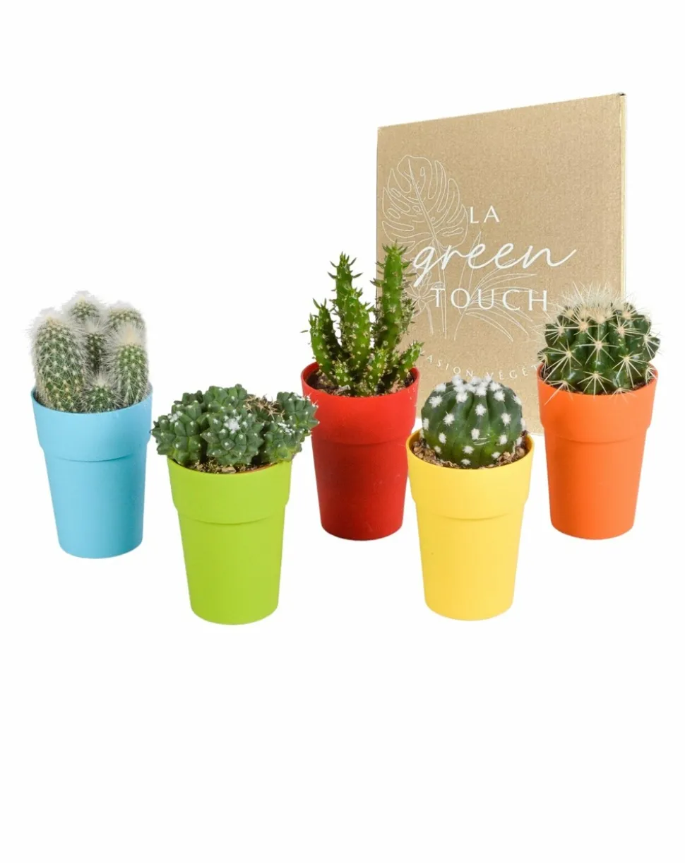 Le « Mix de 5 cactus et leurs caches-pots colorés » est un ensemble parfait pour ajouter une touche de verdure à votre intérieur. Chaque ensemble comprend cinq cactus variés, soigneusement sélectionnés pour leur beauté et leur facilité d’entretien. Ces plantes résistantes à la sécheresse sont idéales pour ceux qui cherchent à ajouter de la vie à leur maison ou leur bureau, mais qui ne disposent pas de beaucoup de temps pour l’entretien des plantes.Physiquement, chaque cactus présente un aspect unique, avec des tailles et des formes différentes. Certains sont petits et ronds, avec des épines douces et courtes qui créent un motif fascinant sur leur surface. D’autres sont plus grands et plus allongés, avec des épines plus longues et plus fines. Les couleurs varient également, allant du vert clair au vert foncé, avec parfois des touches de blanc, de jaune ou de rouge.Les caches-pots inclus sont un autre atout de cet ensemble. Chaque pot est peint d’une couleur différente, ce qui permet de créer un affichage visuellement intéressant. Les pots sont également conçus pour permettre un drainage adéquat, ce qui est essentiel pour la santé des cactus.Que vous soyez un jardinier débutant ou expérimenté, ces cactus et leurs caches-pots colorés sont un excellent choix. Ils apportent une touche d’exotisme et de couleur à n’importe quel espace, tout en nécessitant peu d’entretien. En outre, comme chaque ensemble comprend cinq cactus différents, vous pouvez les disposer ensemble pour créer un affichage impressionnant, ou les répartir dans différents espaces pour répandre la verdure dans toute votre maison ou votre bureau.