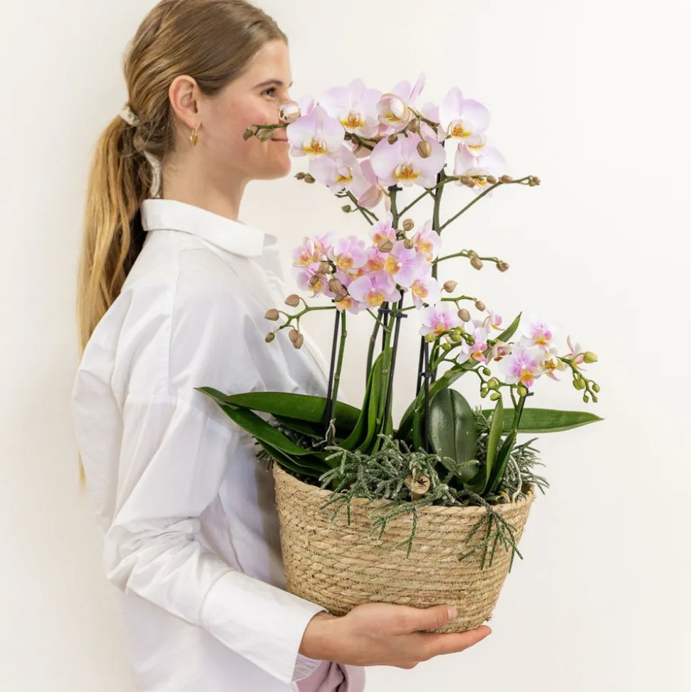 Composez votre propre bouquet Kolibri avec un panier en roseau ou en coton. Les inlays avec réservoir d’eau et les WaterWicks, disponibles séparément, sont indispensables pour cela. Choisissez parmi trois types d’incrustations différentes pour composer un bouquet Mono, Field ou Jungle. Lors de l’achat d’une incrustation séparée, les mèches d’eau sont également incluses. Les incrustations ont un diamètre d’environ 25 centimètres. L’insert Field peut être rempli d’une Orchidée Kolibri de 12 centimètres, de deux Orchidées Kolibri de 9 centimètres et de trois Verts Kolibri de 6 centimètres.Étapes pour créer un bouquet Kolibri:1. Remplissez le réservoir d’eau jusqu’à la ligne indiquée. Assurez-vous que l’eau ne dépasse pas cette ligne pour éviter que les racines de l’orchidée ne soient immergées, ce qui n’est pas souhaitable pour la plante.2. Enfoncez les WaterWicks dans le fond du pot de culture jusqu’à ce qu’ils soient complètement insérés.3. Veillez à ce que les WaterWicks soient bien sous l’eau. Ils permettent aux plantes de s’approvisionner en eau. Après avoir placé les orchidées dans l’incrustation, placez l’ensemble dans le panier en roseau ou en coton.4. Vérifiez le niveau d’eau dans le réservoir une fois par semaine en retirant le réservoir du bol. Remplissez à nouveau si nécessaire en ajoutant de l’eau par le centre de l’inlay.