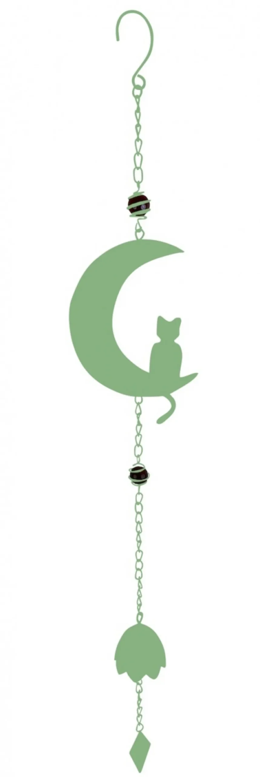 Ajoutez une touche d’originalité et de sérénité à votre espace extérieur avec ce carillon en métal, modèle Chat-Lune.