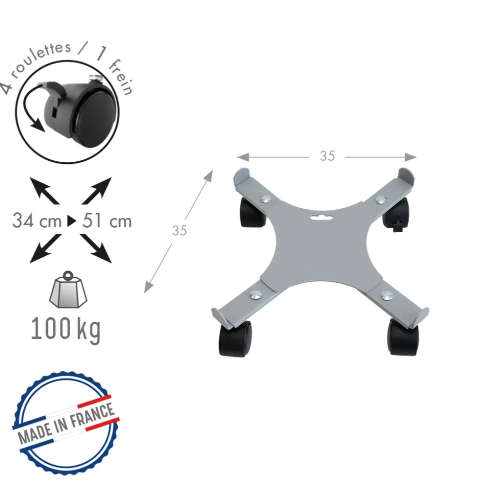Ce support extensible en métal gris aluminium est muni de 4 roulettes (dont 1 avec frein), ce qui le rend idéal pour déplacer vos pots et poteries avec facilité.