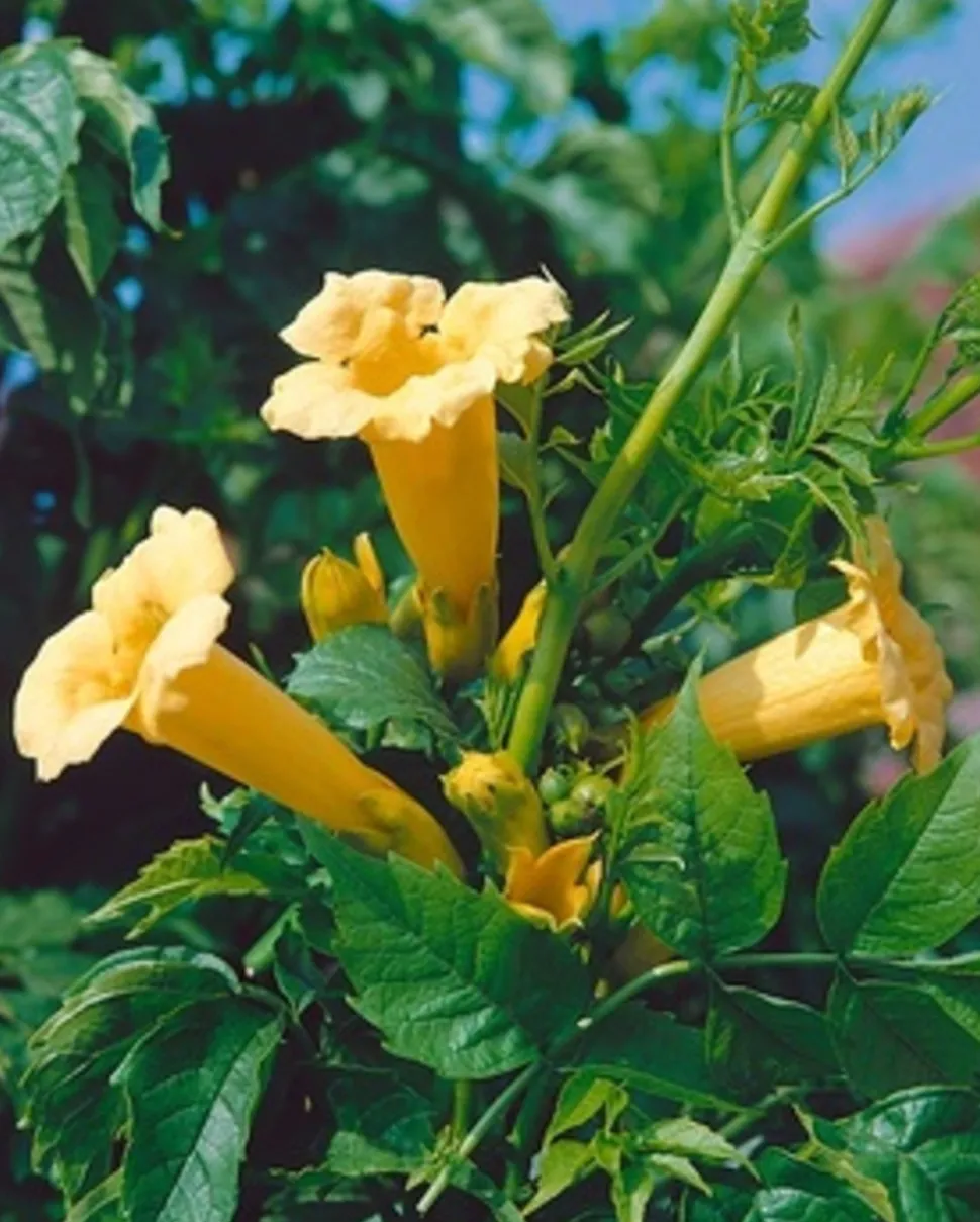 - Flowers: The trumpet-shaped flowers are bright yellow, measuring about 2 to 3 inches in length. They bloom in clusters and can be seen from mid-summer to early fall.