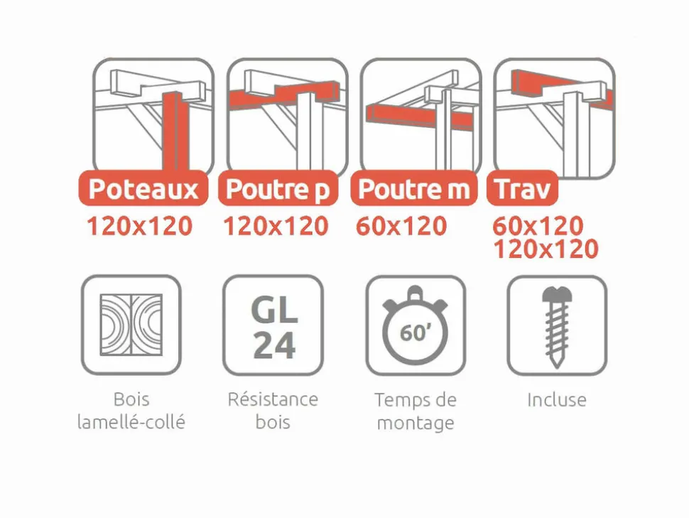 Cette pergola possède 3 poteaux, 2 poutres porteuses, 2 poutres de mur et 8 traverses. Sa conception robuste garantit une grande stabilité face aux conditions extérieures.