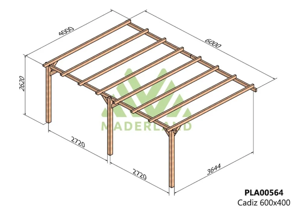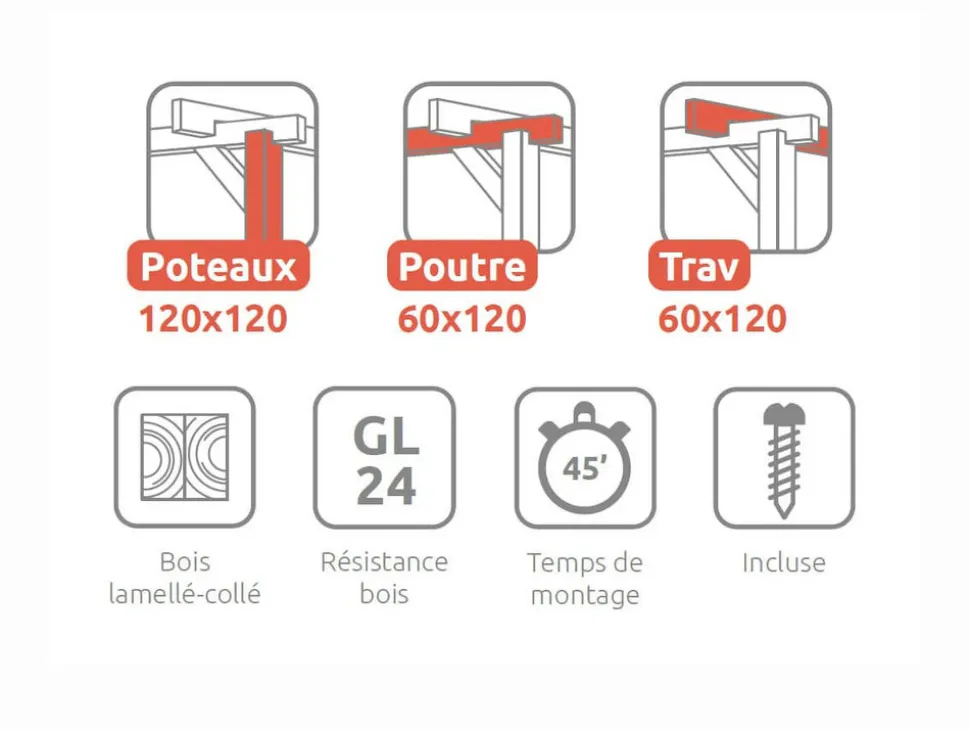 Cette pergola est composée de 3 poteaux, 4 poutres et 8 traverses, assurant une parfaite répartition des charges pour une stabilité optimale. Les poutres porteuses jouent un rôle central dans la solidité de la structure, suivies des traverses et des poteaux.