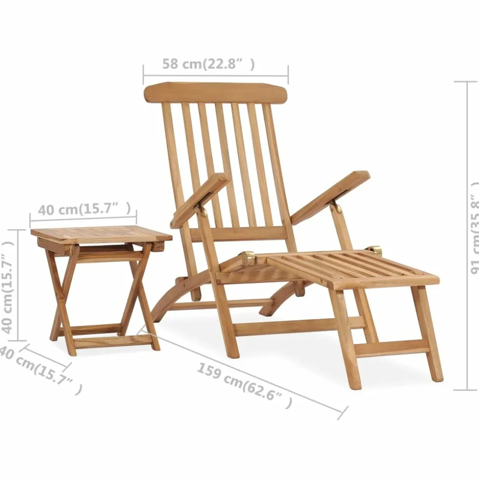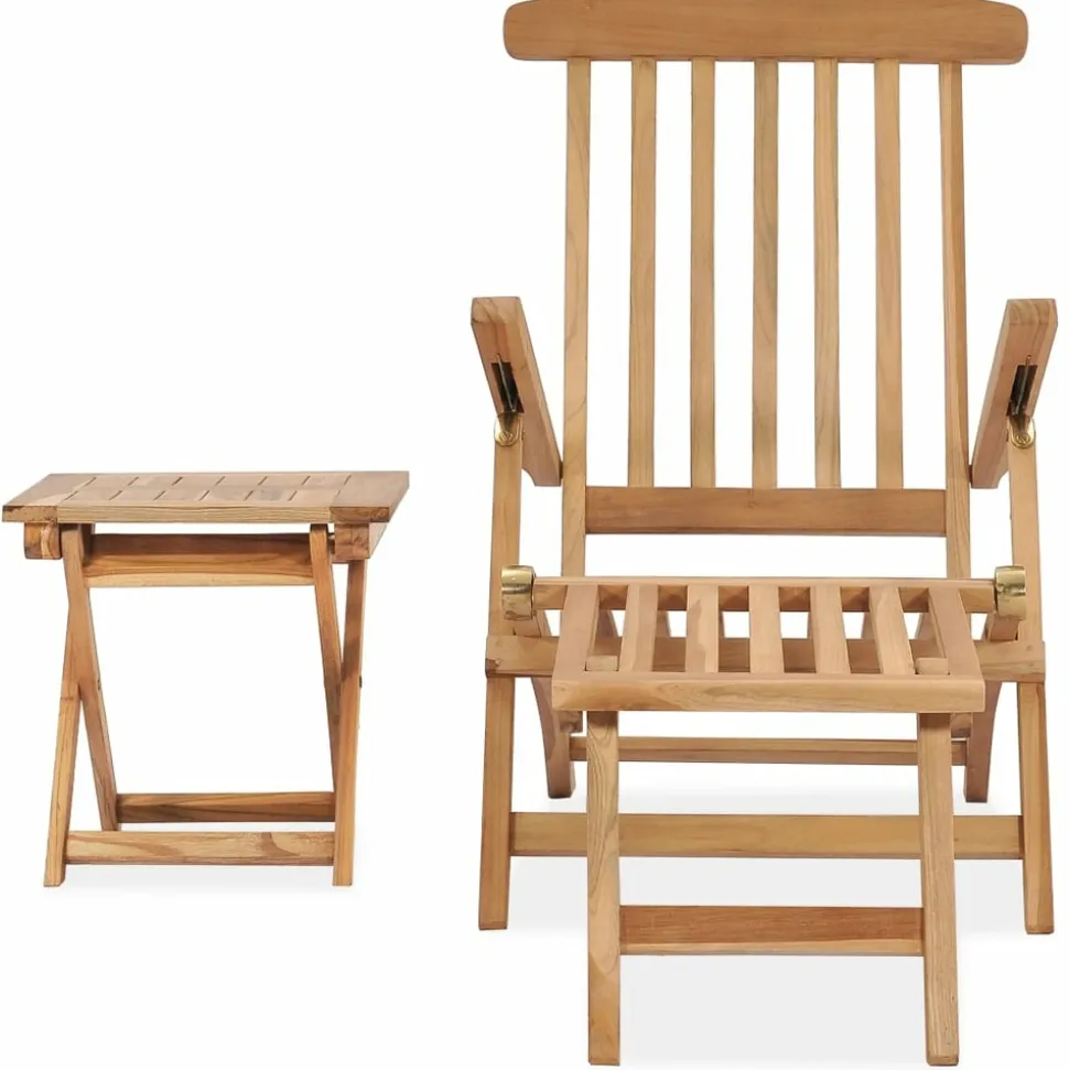 Détendez-vous dans le jardin ou sur le patio sur cette chaise longue confortable ! Elle deviendra l’un de vos endroits préférés pour vous asseoir ! Fabriquée en bois dur de teck extrêmement durable, cette pièce de meuble en teck a été chevronnée, séchée au four puis finement poncée pour lui donner un aspect très lisse. Le bois de teck est connu pour sa résistance exceptionnelle aux intempéries, ce qui le rend bien plus adapté aux meubles de jardin que tout autre type de bois. Le bois de teck est le choix idéal si vous souhaitez acheter un meuble de jardin durable. Ses larges accoudoirs, son dossier haut et son siège profilé ajoutent à l’attrait visuel de la chaise longue ainsi qu’à son confort d’assise. Le dossier s’incline pour que vous puissiez trouver la position la plus confortable. De plus, le repose-pied amovible complète le design classique de la chaise longue d’extérieur et la rend encore plus confortable. De plus, la table vous permet de placer votre téléphone, vos lunettes de soleil, votre boisson et autres petits objets. Lorsqu’elles ne sont pas utilisées, la chaise longue et la table peuvent être facilement repliées pour gagner de la place.
