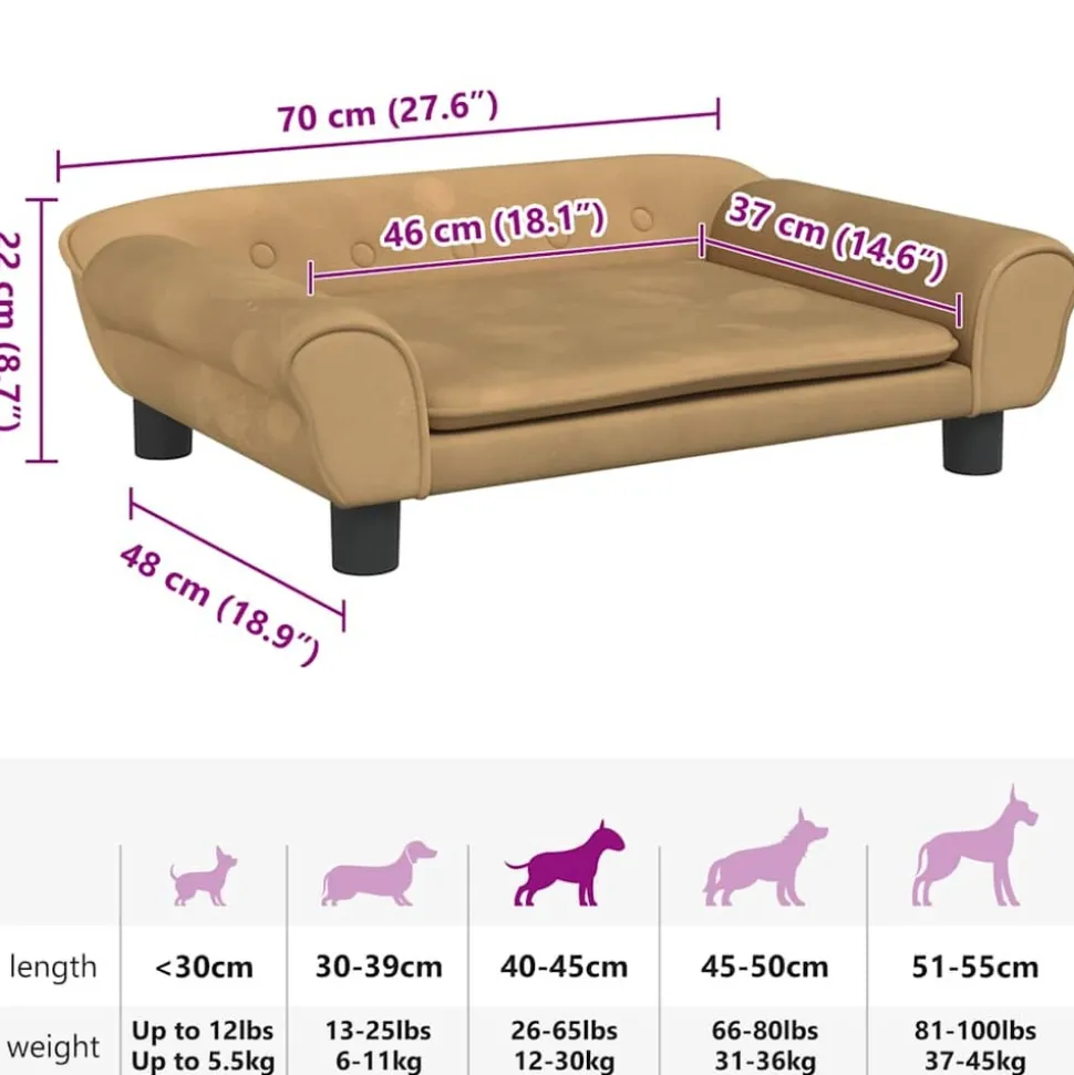 Offrez à votre ami à fourrure un endroit chaud et confortable pour se détendre avec ce lit pour chiens ! Matériau confortable et doux : le canapé pour animal de compagnie est rembourré de mousse épaisse et douce et recouvert de velours, offrant un soutien suffisant et un confort supérieur pour que votre adorable animal de compagnie puisse s’y reposer.Cadre robuste et durable : le cadre en bois de pin massif assure la robustesse et la durabilité du canapé pour chien. Les quatre pieds ajoutent également une stabilité supplémentaire.Design élégant : ce canapé pour chien s’adapte parfaitement à tous les thèmes de décoration et constitue un excellent complément à votre salon ou à votre chambre à coucher. Remarque :Veuillez mesurer la longueur du corps de votre animal de compagnie avant d’acheter.