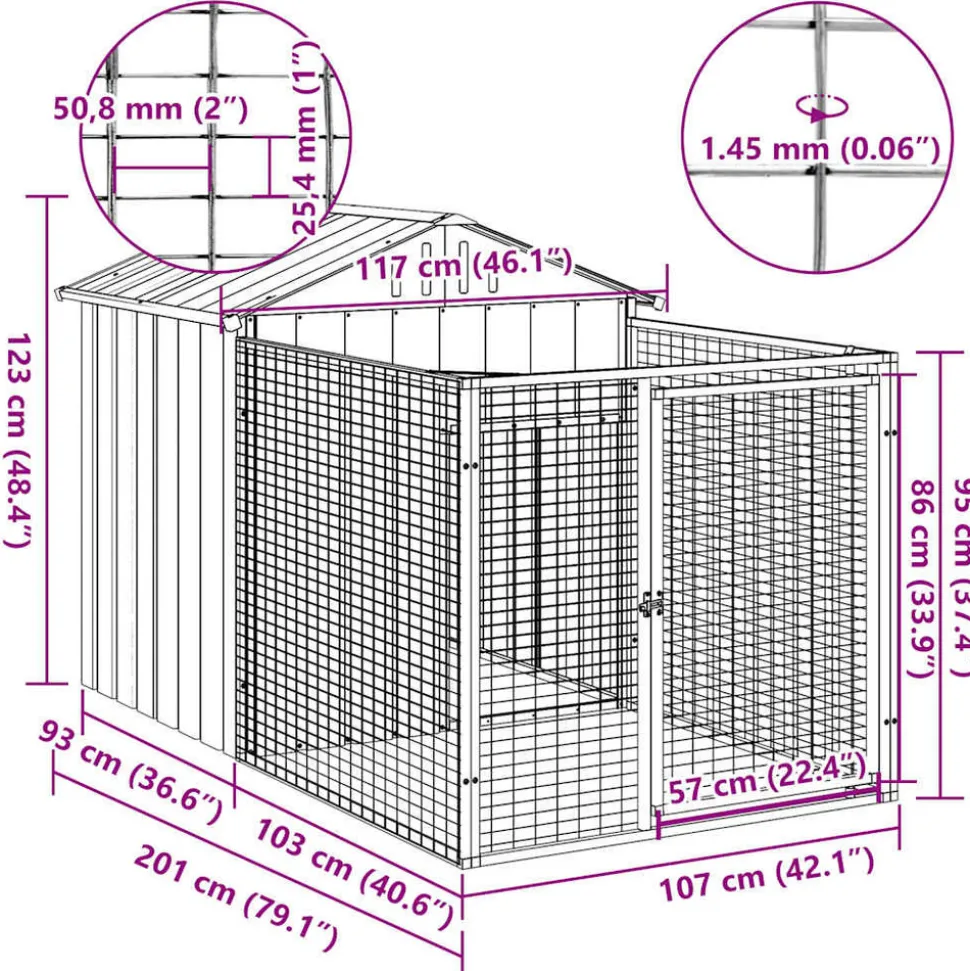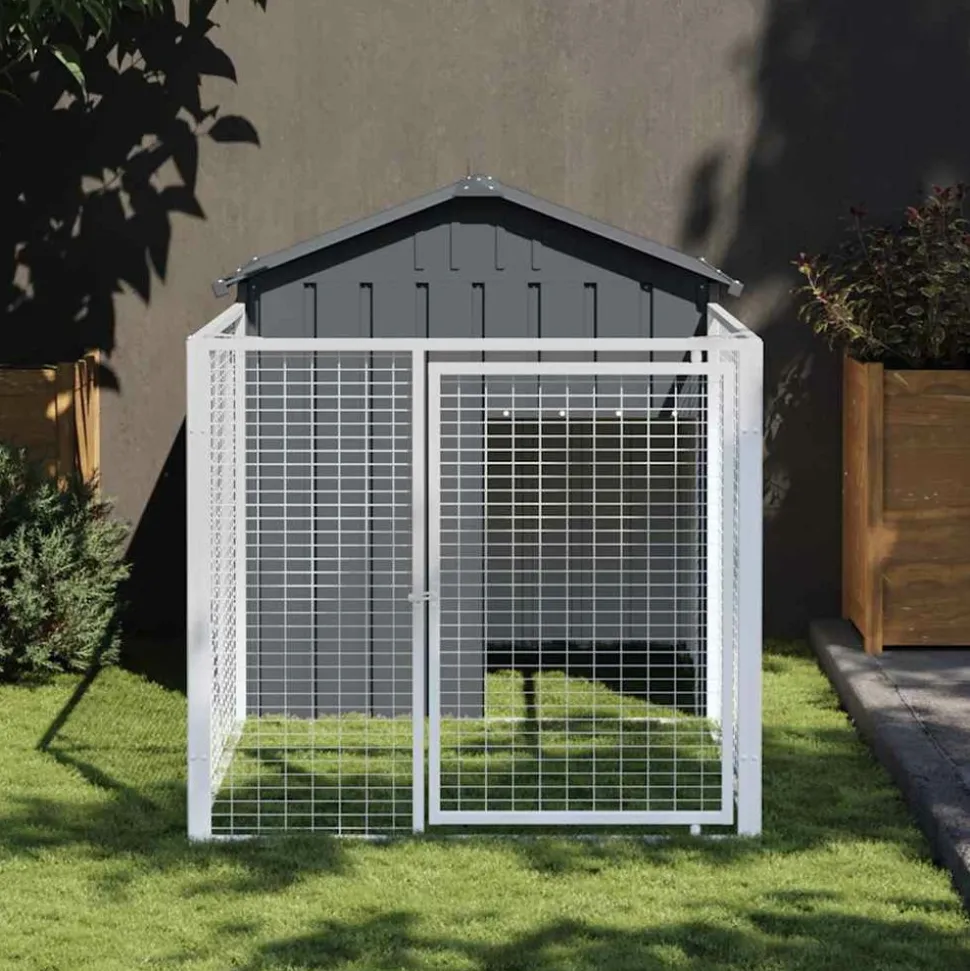 Offrez sécurité et confort à vos compagnons à quatre pattes grâce à cette niche avec enclos. Utilisation polyvalente : Associée à l’enclos allongé, cette niche polyvalente offre un grand espace à votre animal. Elle offre de multiples utilisations : jouer, faire de l’exercice, dresser ou simplement assurer la sécurité de votre chiot. Ce sera le paradis de jeu idéal pour vos amis à quatre pattes !Construction durable : Grâce à sa construction robuste en acier galvanisé, la niche pour chien est durable et conçue pour durer.Conception en maille : La conception en maille de l’enclos prolongé permet d’éviter les méfaits et les accidents inattendus tout en permettant la ventilation.Toit pratique : Le toit de la cage protège le chiot du soleil, de la pluie, de la neige et d’autres conditions météorologiques.Accès pratique : Il y a une entrée à la maisonnette et une porte avec un loquet sur l’enclos prolongé, toutes deux facilitant l’entrée et la sortie.Bon à savoir :Pour éviter les dommages causés par une forte accumulation de neige, nous vous recommandons de dégager le toit régulièrement en hiver.