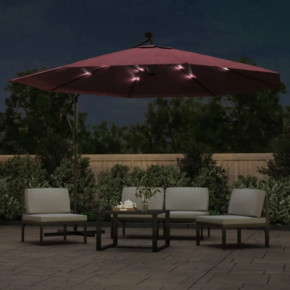 Cet élégant parasol suspendu avec lumières LED est parfait pour créer de l’ombre et vous protéger des rayons UV nocifs. Fabriquée en polyester anti-UV et anti-décoloration, la toile de parasol vous offre une protection optimale contre le soleil et est facile à nettoyer. Le parasol dispose de 24 LED à énergie solaire pour éclairer automatiquement votre espace de vie extérieur et créer une ambiance chaleureuse et romantique quand le soleil se couche. Il est également livré avec une base croisée robuste pour une stabilité accrue. Le design exclusif de ce parasol vous permet d’incliner le parasol pour cacher le soleil alors qu’il se dirige vers l’horizon. Le mât en métal résistant, ainsi que les 8 nervures durables, rendent le parasol très stable et durable. Notre parasol de jardin peut être ouvert et fermé facilement grâce au mécanisme à manivelle. Veuillez noter que nous vous recommandons de traiter le tissu du parasol avec un spray imperméabilisant s’il est soumis à des fortes précipitations.