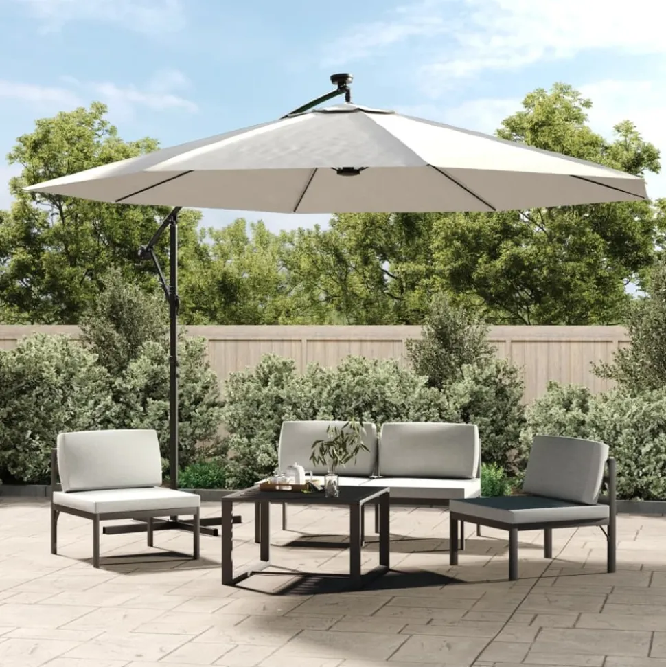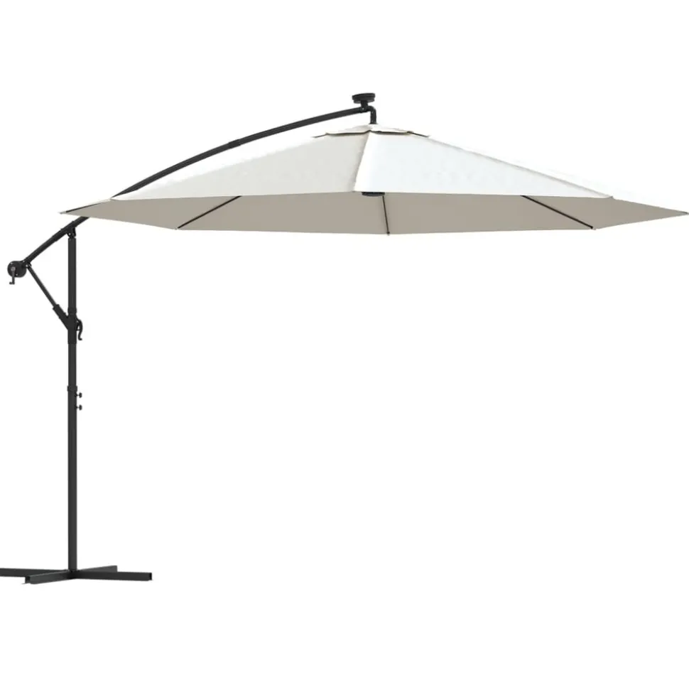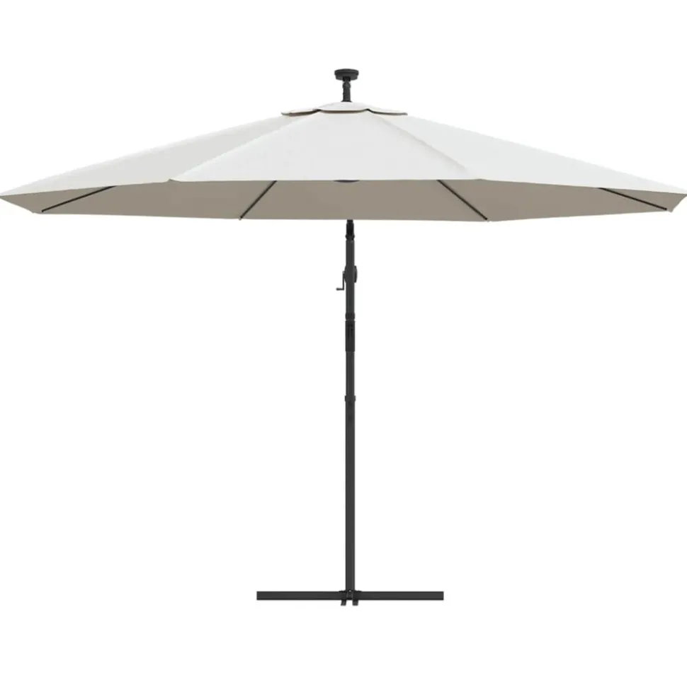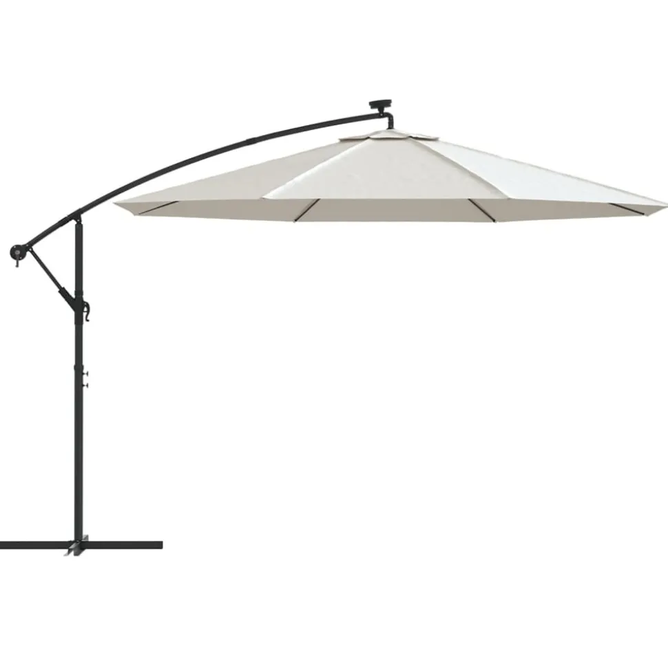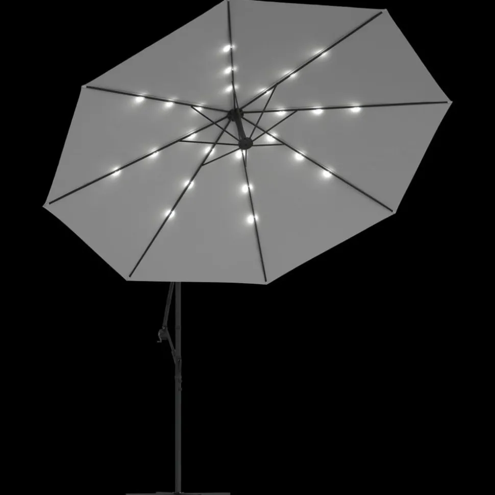 Cet élégant parasol suspendu avec lumières LED est parfait pour créer de l’ombre et vous protéger des rayons UV nocifs. Fabriquée en polyester anti-UV et anti-décoloration, la couverture de parasol vous offre une protection optimale contre le soleil et est facile à nettoyer. Il dispose de 24 LED à énergie solaire pour éclairer automatiquement votre espace de vie extérieure et créer une ambiance chaleureuse et romantique quand le soleil se couche. Il est également livré avec une base croisée robuste pour ajouter de la stabilité. Le design exclusif de ce parasol vous permet d’incliner le parasol pour bloquer le soleil qui se dirige vers l’horizon. Le poteau en métal résistant, ainsi que les 8 nervures durables, rendent le parasol très stable et durable. Notre parasol de jardin peut être ouvert et fermé facilement grâce au mécanisme à manivelle. L’article est facile à assembler. Veuillez noter que nous vous recommandons de traiter le tissu du parasol avec un spray imperméabilisant s’il est soumis à des fortes précipitations.