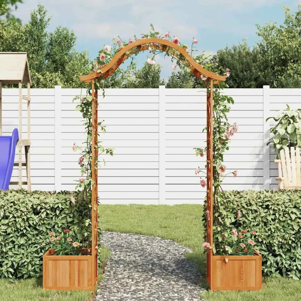 Cette pergola en bois polyvalente avec portail est destinée à être un supplément décoratif à votre jardin ou à tout autre espace extérieur. Fabriquée en bois de sapin massif, cette arche de jardin est résistante aux intempéries et durable. La belle arche est magnifique comme entrée, passage ou pour décorer votre allée de jardin. Les deux jardinières latérales offrent un espace supplémentaire pour faire pousser de belles fleurs. Lorsque les vignes grimperont, vous ne pourrez plus retirer vos yeux de cette belle pergola.