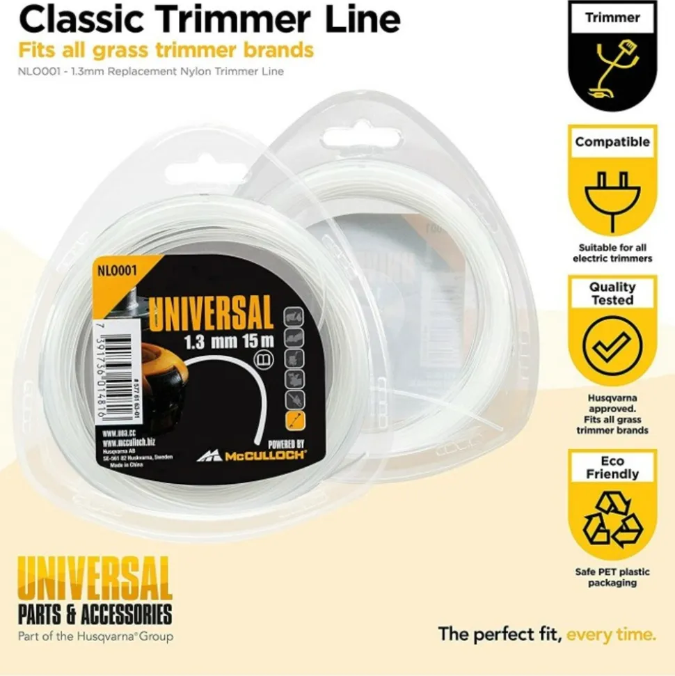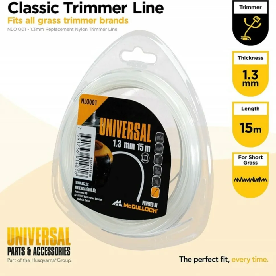 Ligne de coupe Universal – Accessoire d’origine de qualité McCulloch éprouvée : Le fil de nylon Universal est idéal pour tailler le gazon et les broussailles en toute tranquillité. Grâce à une technologie brevetée, les pousses, les chardons et même l’herbe dure sont coupés proprement et, surtout, sans bruit. Le fil de coupe est en nylon résistant et durable.Fil nylon rond 1,3 mm x 15 m de la marque UniversalQualité McCulloch : La ligne de fauchage coupe l’herbe et les broussailles avec une précision maximale et assure une coupe netteDurabilité : Le fil en nylon est résistant à la déchirure et peut être utilisé pendant longtempsFil de coupe de haute qualité : Le fil a une longueur de 15 m