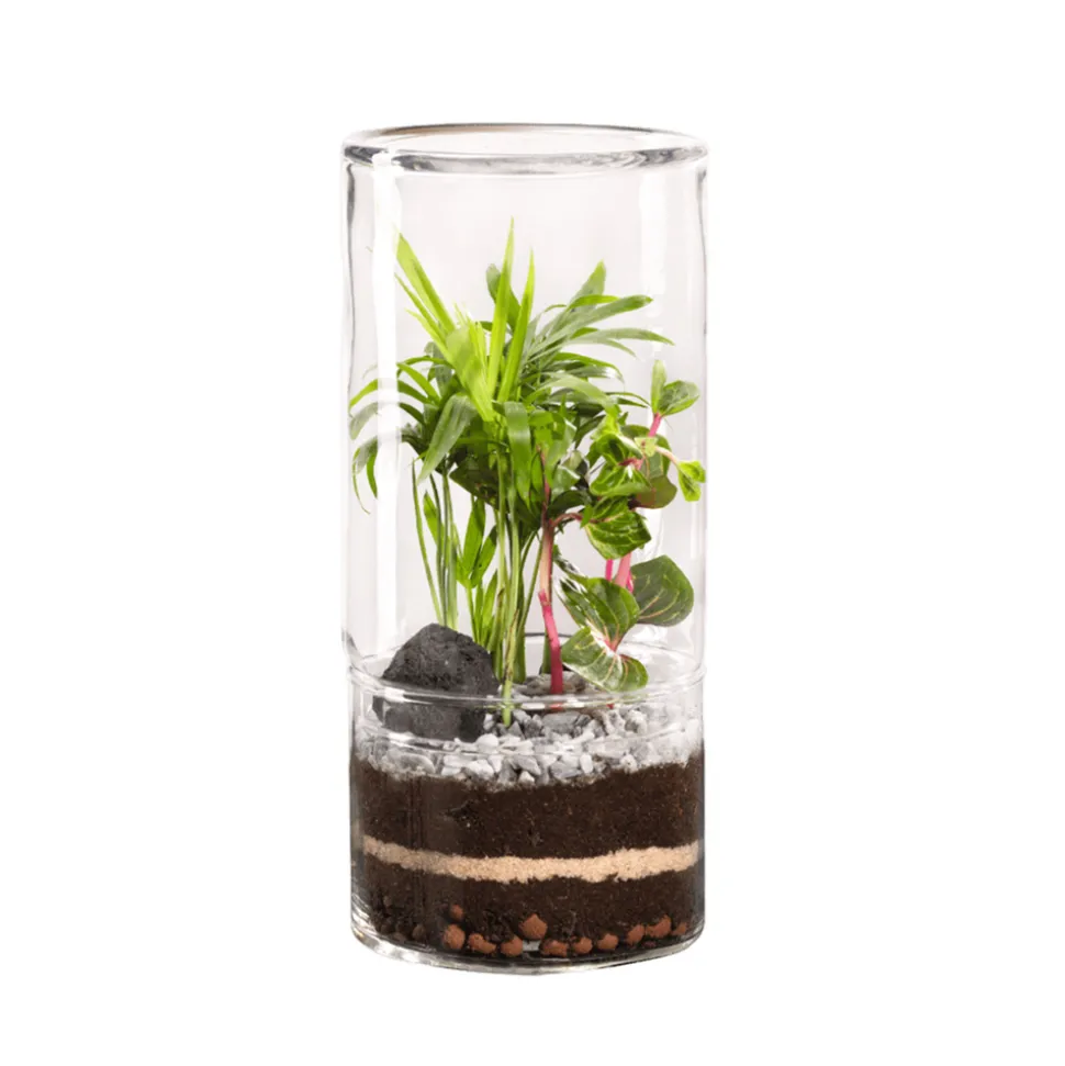 Quoi de plus rafraichissant que de disposer d’un petit morceau de verdure à la maison ne vous demandant aucun soin contraignant ? Avec ce joli terrarium, la nature s’invite chez vous. Les plantes à la maison sont bien plus que de simples décorations, elles offrent dans chaque pièce une touche végétale qui contribue à l’ambiance apaisante, conviviale et chaleureuse de votre intérieur. Un véritable cycle biologique naturel se met en place pour rendre votre terrarium quasiment autonome. Durant la journée, la photosynthèse, sous l’action de la lumière, permet aux plantes d’absorber le dioxyde de Carbonne pour contribuer à leur développement, tout en rejetant de l’oxygène. La nuit c’est l’inverse. Cette action va créer la condensation nécessaire au bon développement de la plante. Le terrarium condense en général le matin et le soir. Terrarium végétal d’intérieur, Green Tower taille M : Mix D.12cm.
