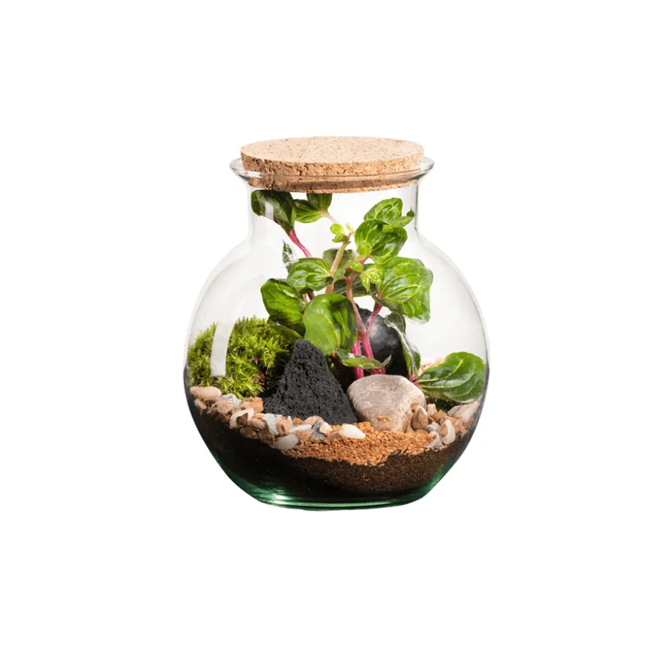 Les terrariums Naturalys sont confectionnés dans les ateliers de la société en Avignon à partir d’un terreau spécifiquement élaboré pour ce type de culture. La réussite de ce terrarium tient à l’équilibre entre sol, humidité et plantes. Dans les premiers jours, ouvrez régulièrement votre terrarium pour le faire respirer. Un terrarium fermé a des besoins en eau très limités. Quelques gouttes déposées sur la mousse suffisent souvent. Veillez à ce que l’eau ne dépasse jamais la hauteur de la couche de pouzzolane ou de billes.
