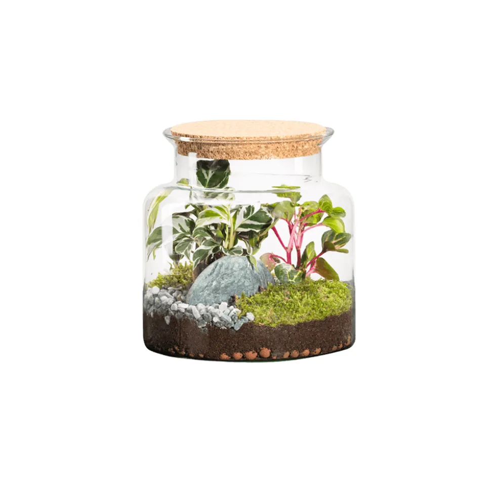 Les terrariums Naturalys sont confectionnés dans les ateliers de la société en Avignon à partir d’un terreau spécifiquement élaboré pour ce type de culture. La réussite de ce terrarium tient à l’équilibre entre sol, humidité et plantes. Dans les premiers jours, ouvrez régulièrement votre terrarium pour le faire respirer. Un terrarium fermé a des besoins en eau très limités. Quelques gouttes déposées sur la mousse suffisent souvent. Veillez à ce que l’eau ne dépasse jamais la hauteur de la couche de pouzzolane ou de billes.