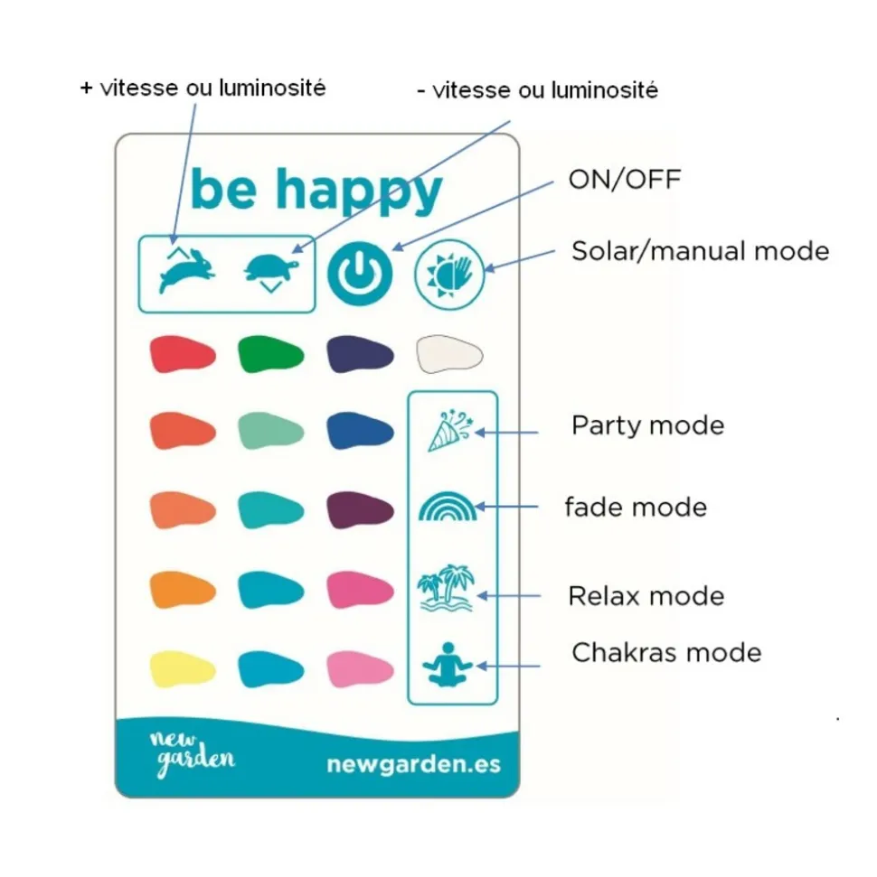 Pilotable et programmable avec télécommande fournie : ON-OFF, mode manuel ou auto., différentes transitions et couleurs inclus blanc, vitesse de transition, intensité lumineuse. (Diminuer l’intensité lumineuse permet d’augmenter encore l’autonomie)