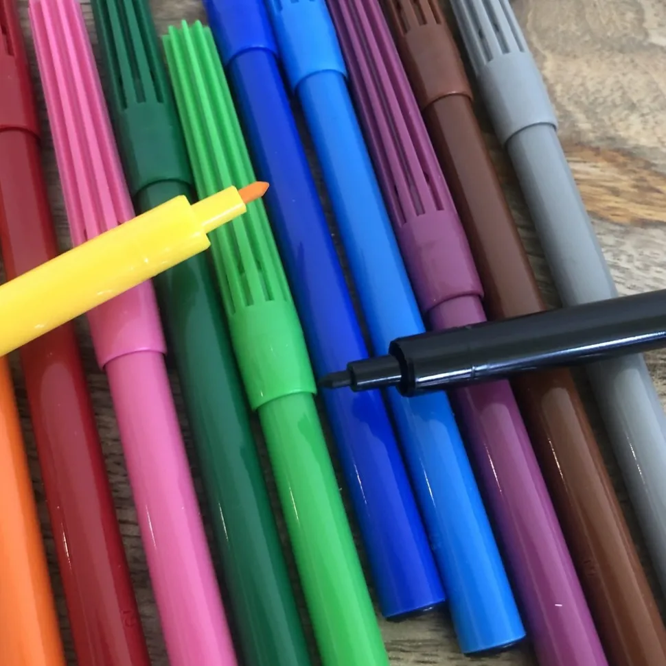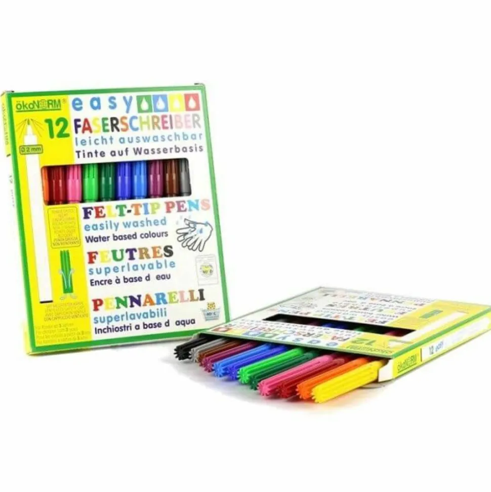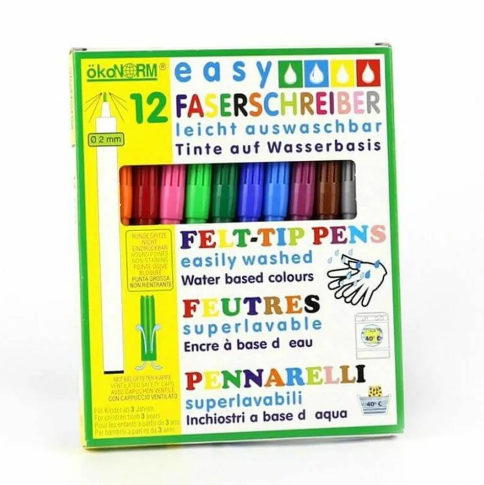 Set de 12 feutres lavables à l’eau. En effet l’encre des feutres est conçu à base d’eau, c’est pourquoi les couleurs se lavent facilement : dès 40°C sur les tissus. Idéal pour réaliser ses premiers coloriages ! Pointes fines : 2 mm. Les feutres sont conçus sans l’utilisation de substances nocives. Capuchon de sécurité ventilé. Âge à partir de : 3 ans.