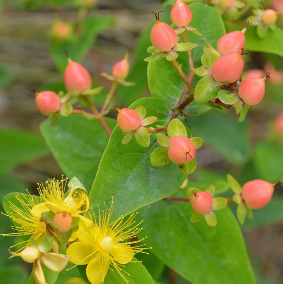 l’Hypericum x inodorum Magical® Pumpkin ‘Kolmapuki’, également connu sous le nom de Millepertuis arbustif Magical Pumpkin :Hypericum x inodorum Magical® Pumpkin ‘Kolmapuki’Cette variété d’Hypericum est un arbuste particulièrement apprécié pour ses qualités ornementales et sa facilité de culture. Voici ses principales caractéristiques :Floraison:Période: La floraison s’étale généralement de mai à juin, puis peut se répéter jusqu’en septembre.Fleurs: Les fleurs sont de couleur jaune vif, composées de nombreuses étamines qui leur confèrent un aspect léger et aérien.Abondance: La plante se couvre d’une multitude de fleurs, offrant un spectacle lumineux et coloré.Fructification:Période: Les fruits apparaissent en juillet et persistent jusqu’en septembre.Couleur: Ce qui caractérise particulièrement cette variété, ce sont ses fruits en forme de petites baies d’une couleur orange saumonée, très décorative.Intérêt: Ces grappes de baies offrent un contraste élégant avec le feuillage vert et prolongent l’intérêt ornemental de l’arbuste bien après la floraison.Feuillage:Couleur: Le feuillage est d’un vert relativement foncé, ce qui met en valeur la couleur vive des fleurs et des fruits.Qualité: Le feuillage est semi-persistant, ce qui signifie qu’il peut persister en partie pendant l’hiver dans les régions aux hivers doux.Résistance: Cette variété est réputée pour sa résistance à la rouille, une maladie fréquente chez les Hypericum.Port:Compact: L’Hy