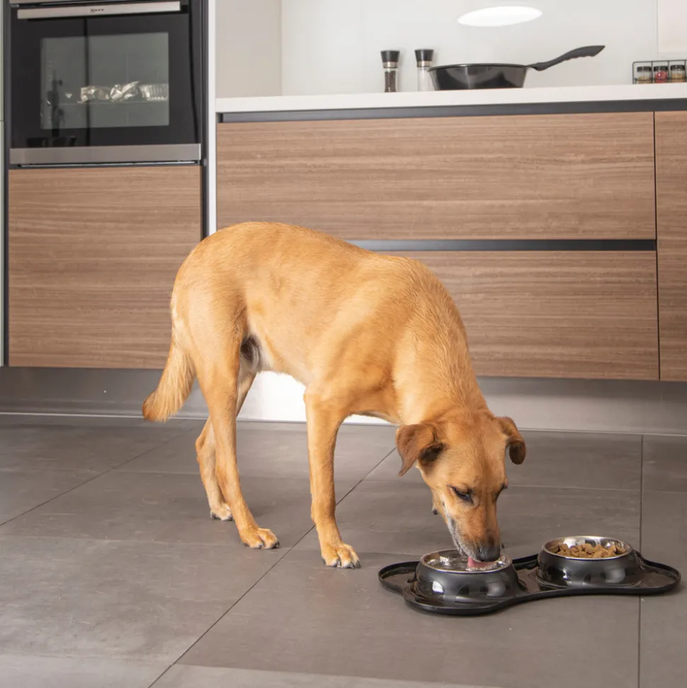 Dimensions : L. 45 x l. 27 cmBol : D. 14 x H. 9 cmMatière : InoxSpécificités : Pratique & EfficaceGamelle DoubleSupport en PlastiquePour Chiens Forme OsCouleur : Noir