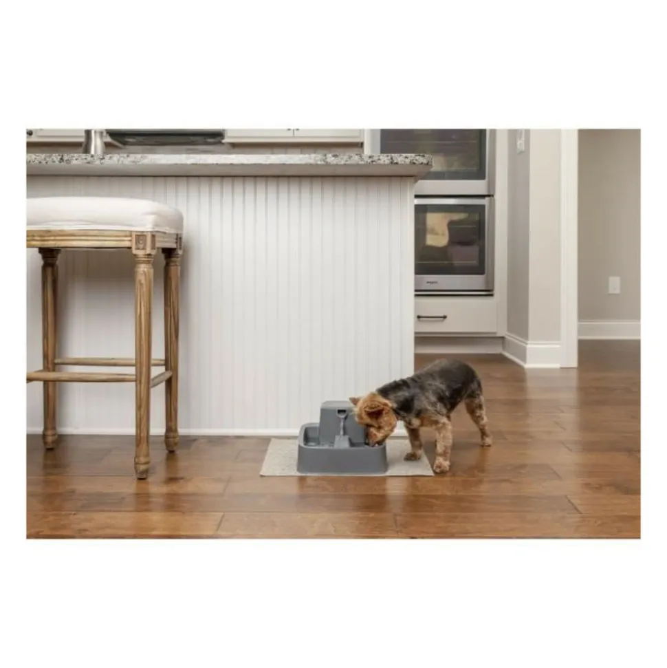 Cette fontaine en plastique sans BPA de Drinkwell est équipée d’une double filtration, le filtre en mousse capture les impuretés, le filtre au charbon actif élimine les mauvais goûts et mauvaises odeurs. Débit d’eau réglable. Capacité 1.8L.