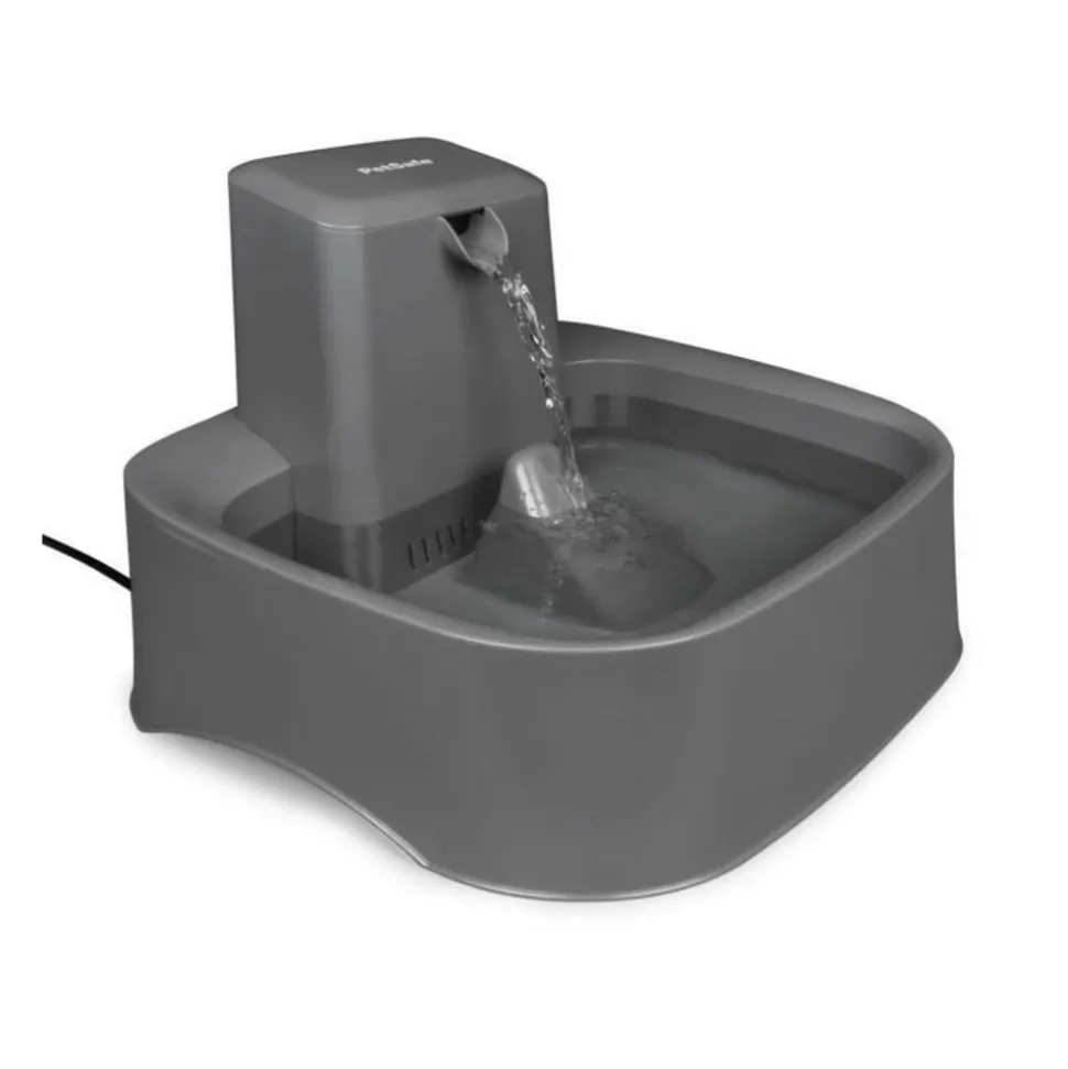 Cette fontaine en plastique sans BPA de Drinkwell est équipée d’une double filtration, le filtre en mousse capture les impuretés, le filtre au charbon actif élimine les mauvais goûts et mauvaises odeurs. Débit d’eau réglable. Capacité 7.5L.