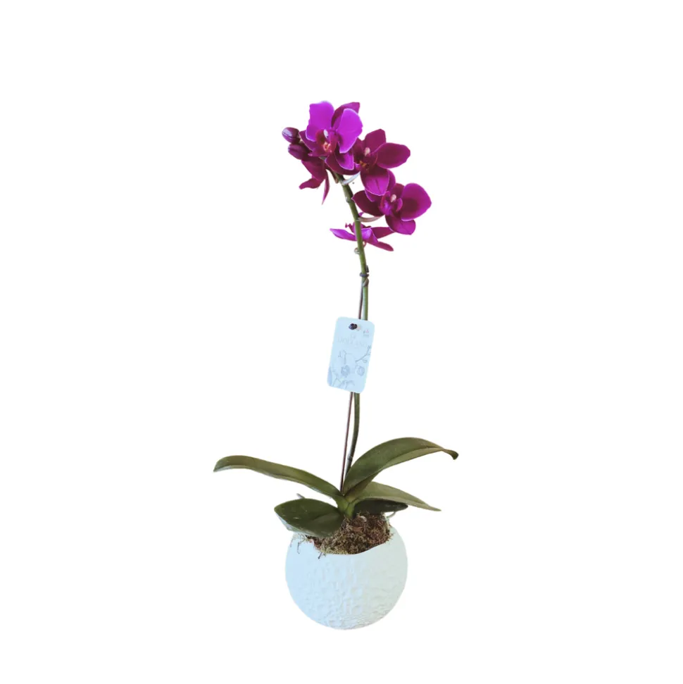 La famille des Orchidacées, une des plus importantes du règne végétal, comprend plus de 25000 espèces répandues sur tous les continents à l’exception de l’Antarctique. La plupart de ces espèces sont originaires des zones humides des régions tropicales et subtropicales. Phalaenopsis ou Orchidée papillon (leurs fleurs ressemblent à des papillons), est un genre qui comprend environ 46 espèces, originaires de l’Inde, du Sud-Est de l’Asie, de l’Indonésie, des Philippines et du Nord de l’Austalie. De nombreux hybrides sont apparus ces dernières années. Orchidée épiphyte, monopodiale sans pseudobulbes.