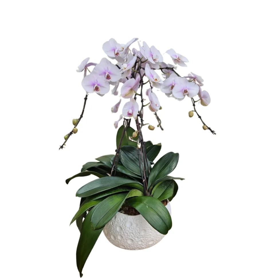 La famille des Orchidacées, une des plus importantes du règne végétal, comprend plus de 25000 espèces répandues sur tous les continents à l’exception de l’Antarctique. La plupart de ces espèces sont originaires des zones humides des régions tropicales et subtropicales. Phalaenopsis ou Orchidée papillon (leurs fleurs ressemblent à des papillons), est un genre qui comprend environ 46 espèces, originaires de l’Inde, du Sud-Est de l’Asie, de l’Indonésie, des Philippines et du Nord de l’Austalie. De nombreux hybrides sont apparus ces dernières années. Orchidée épiphyte, monopodiale sans pseudobulbes.