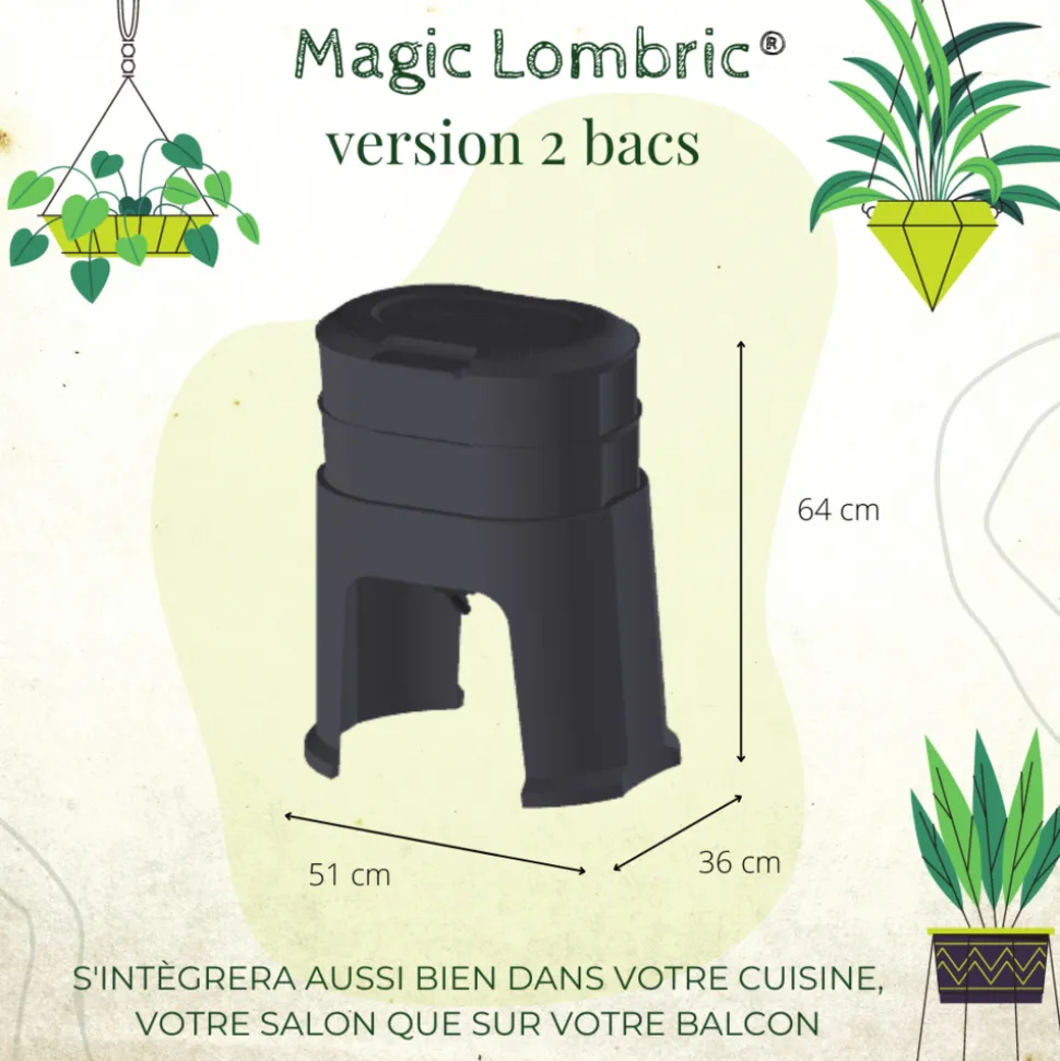 Contenu du pack : lombricomposteur 2 ou 3 bacs au choix – volumes de 28 litres (option 2 bacs) et 42 litres (option 3 bacs). Le kit contient un couvercle, bacs intermédiaires, 1 bac récupérateur de jus, 1 robinet + 1 notice d’utilisation pour vous accompagner pas à pas et 1 tapis de chanvre offert.Adapté à votre intérieur : le Magic Lombric est dédié aux espaces intérieurs comme extérieurs et produit un engrais naturel pour vos plantes grâce à vos biodéchets composés d’épluchures de légumes, fruits, de carton… laissez entrer un peu de nature dans votre maison ou votre appartement.Made in France : la volonté première de Planet Compost est de proposer un lombricomposteur écoresponsable, fabriqué dans les Hauts-de-France, en matière plastique polypropylène recyclé et 100% recyclable.Geste éco-citoyen : en plus de participer à la protection de la planète, on diminue le volume de nos poubelles et on valorise des déchets qui finissent la plupart du temps en fumée.⚠️ Attention : livré sans les vers de compost.