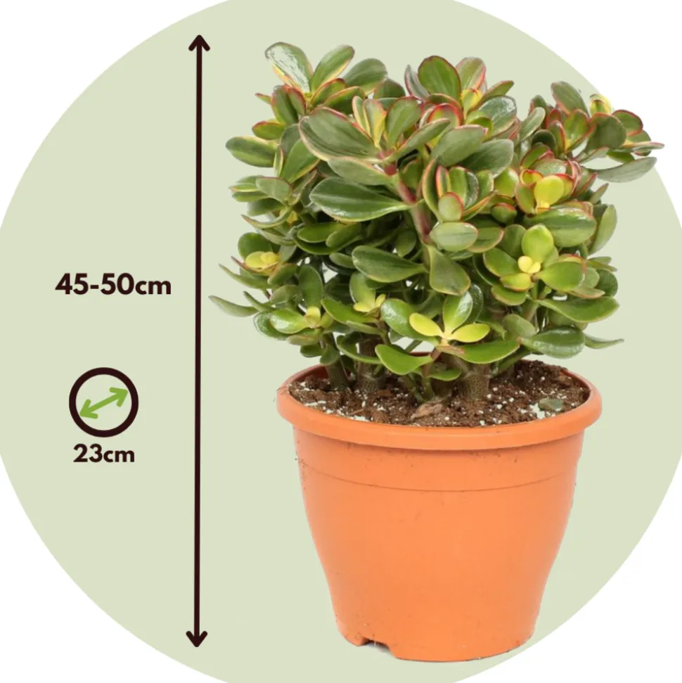 Crassula ovata ‘Sunset’ est un cultivar de la succulente populaire communément appelée plante de jade ou arbre à argent. Elle est appréciée pour son feuillage remarquable aux nuances vibrantes de jaune, d’orange et de rouge, en particulier pendant les périodes où elle reçoit beaucoup de soleil. Sunset’ est une plante à croissance lente connue pour sa résistance et sa facilité d’entretien, ce qui en fait un choix idéal pour les jardiniers novices et expérimentés. Avec les bons soins, Crassula ovata ‘Sunset’ peut devenir une belle addition à n’importe quelle pièce.