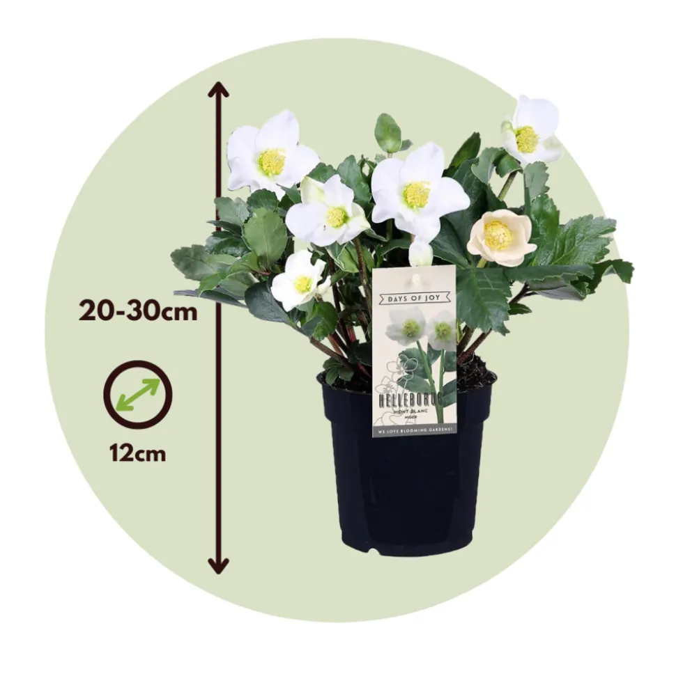 L’hellébore Niger Mont Blanc, également connu sous le nom de rose de Noël, est un atout pour chaque jardin. Cette plante robuste fleurit en hiver avec de belles fleurs blanches en forme de soucoupes. La rose de Noël est particulièrement populaire en raison de sa période de floraison, car elle se situe entre janvier et avril, alors que de nombreuses autres plantes sont encore en hibernation. Les fleurs blanches de l’hellébore Mont Blanc peuvent devenir roses à la fin de sa floraison. La rose de Noël est originaire des zones montagneuses calcaires avec des forêts de conifères des Alpes orientales et des Apennins du Nord. Les feuilles spatulées de l’hellébore Mont Blanc sont plus longues et plus fines que celles de nombreuses autres espèces et hybrides d’hellébore. Le nom ‘Helleborus’ vient des mots grecs elein, qui signifie blesser, et borus, qui signifie nourriture. Cela signifie que le nom de la plante fait référence à sa toxicité.